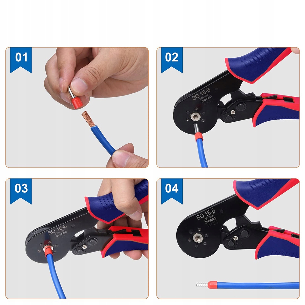 ?Високоякісний інструмент для обтискання? За допомогою набору кліщів для обтискання кінців дроту ви можете надійно затягнути канюлю венозного кінця в діапазоні 0,08–16 мм sup2;. Контактний пристрій автоматично налаштовується на відповідну ізоляційну наконечник.