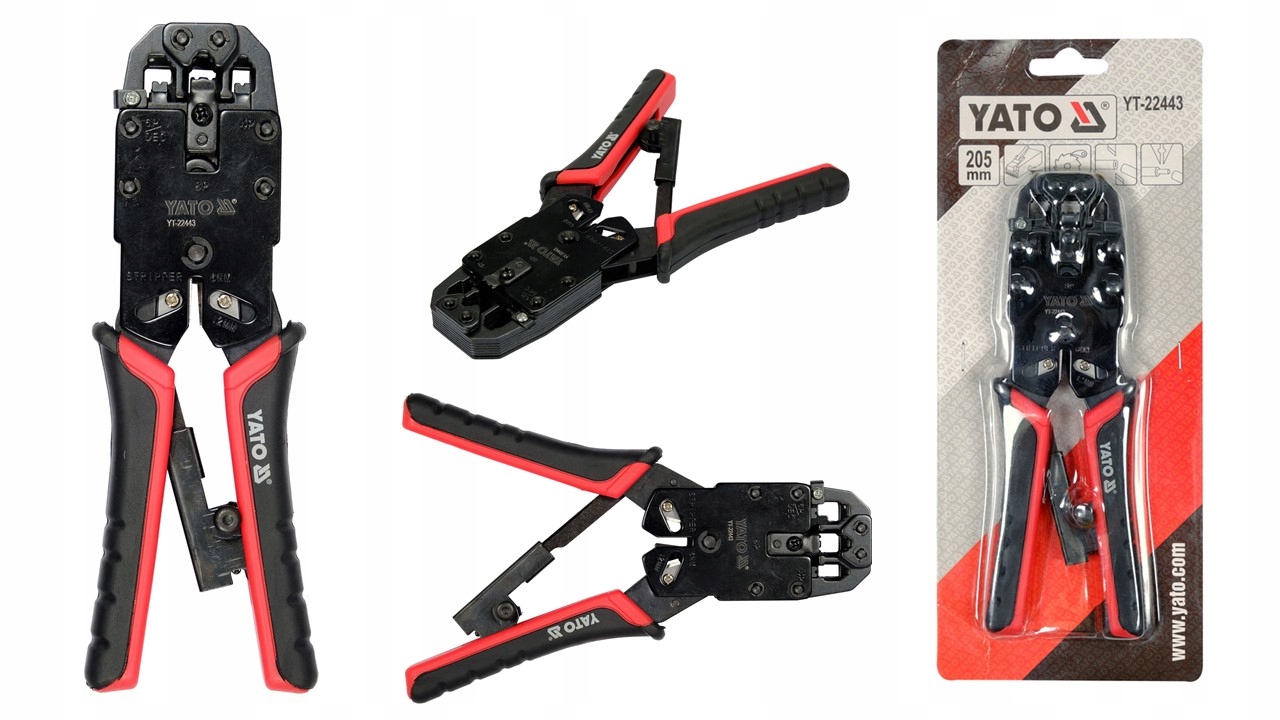 YT-22443 щипці з храповим механізмом для обтиску телефонних і мережевих клем. Плоскогубці виготовлені з вуглецевої сталі, яка пройшла процес окислення, що захищає від корозії. Двокомпонентні пластикові накладки на ручки. Більш твердий PP компонент щільно прилягає до тіла, а зовнішня TPR частина приємна на дотик і має протиковзкі властивості