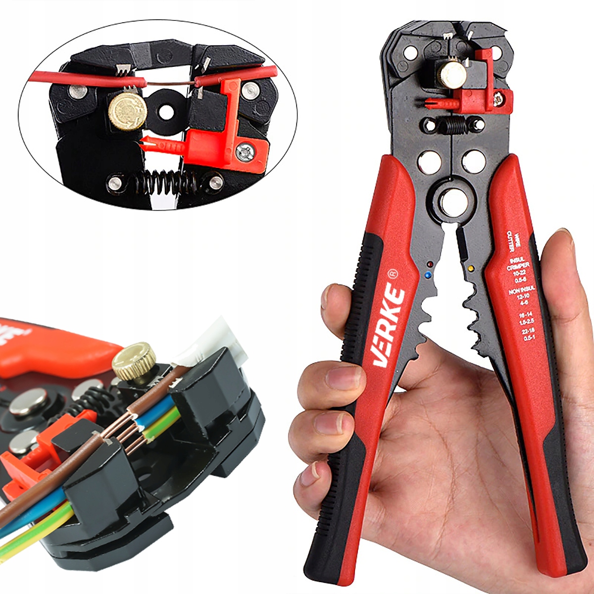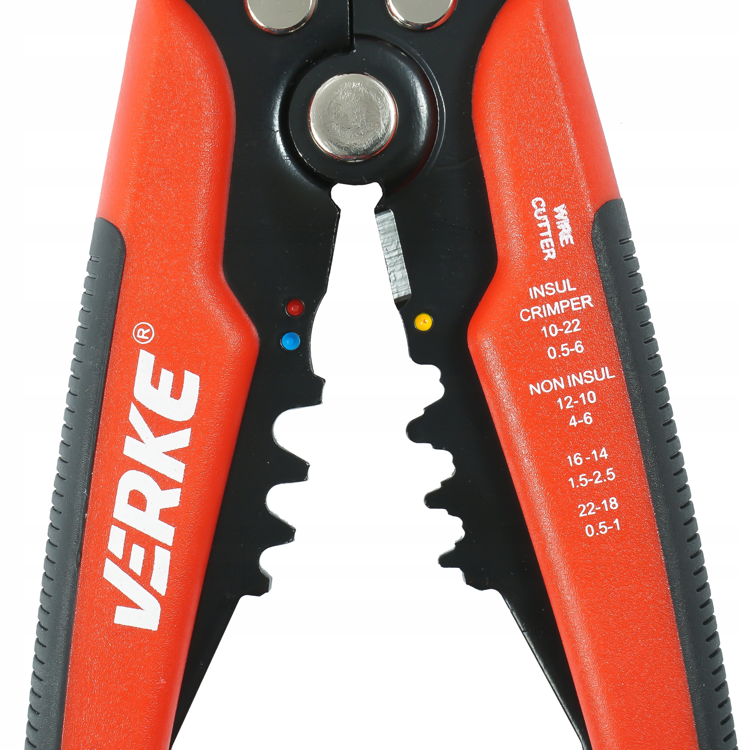 Щипці з набором ізольованих з’єднувачів. Ручки захищені двокомпонентними пластиковими накладками. Конструкція кліщів дозволяє знімати ізоляцію як з кінців, так і з середини дроту. Обмежувач глибини корисний під час встановлення кабелів, наприклад, з’єднувачів або кубиків