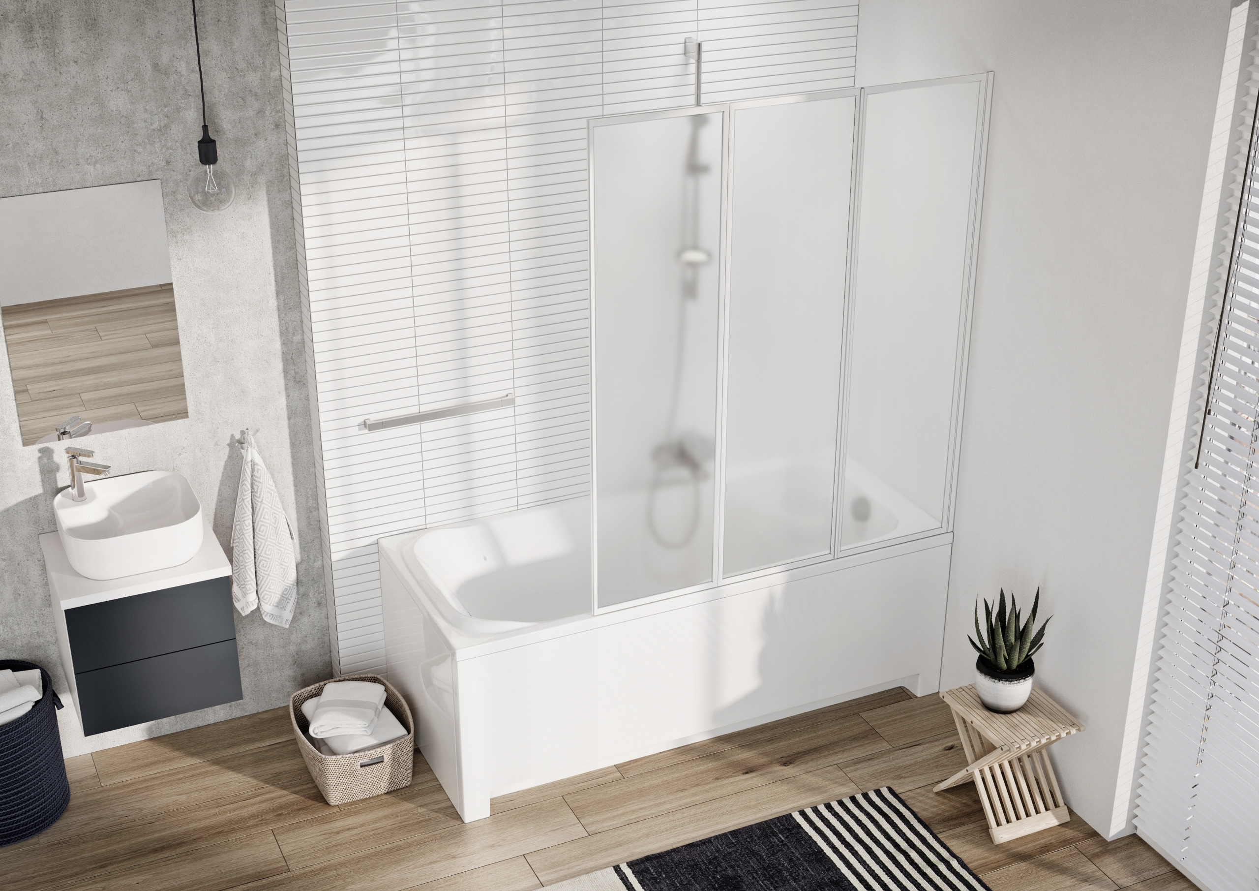 Ущільнювач, що лежить на краю ванни, гарантує відсутність бризок води. впаде на підлогу ванної кімнати, а алюмінієві рами, що заповнюють стулки ширми з оргскла, забезпечать конфіденційність завдяки тонкому малюнку, яким вона покрита.