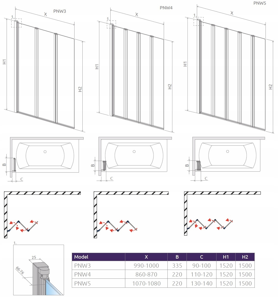 - Поворотна ширма з чотирьох частин (нахиляється всередину та назовні ванни) . Розкладний гармошкою.