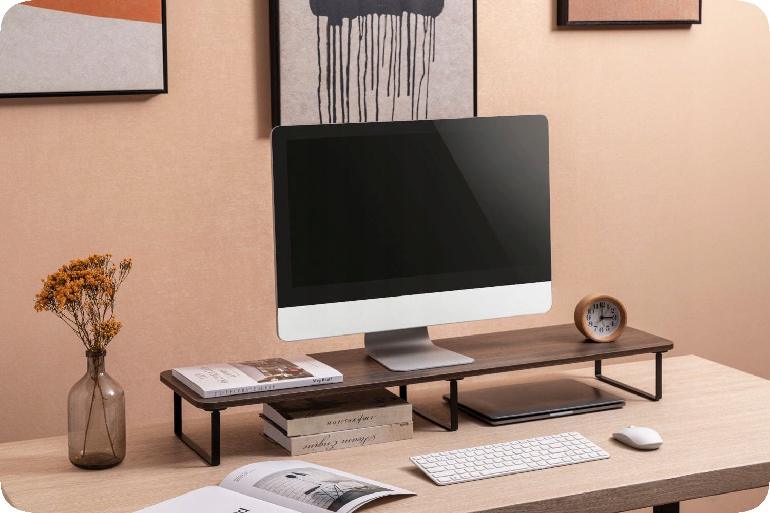 Попрощайтеся з безладом на робочому місці з підставкою Mozos Dual Riser. Замість того, щоб розміщувати монітор прямо на столі, ця високоякісна полиця підніме монітор у ергономічне положення для очей. Він також забезпечує додатковий робочий простір і більше місця для зберігання, що зменшує безлад у вашому робочому та ігровому просторі. Зменште навантаження на очі, працюючи розумніше, зберігаючи шийний відділ хребта. Наш продукт дозволяє розмістити два монітори поруч із розміром до 32". Робота на двох моніторах стала стандартом. Завдяки великій ширині ми можемо вільно організувати простір під і на полиці. Монітор і ноутбук одночасно? немає проблем Міцні сталеві ніжки забезпечують міцну підтримку. Простий, тонкий і пофарбований у колір тикового дерева - він ідеально впишеться в будь-яке мінімалістичне робоче місце. Елегантний, стильний.