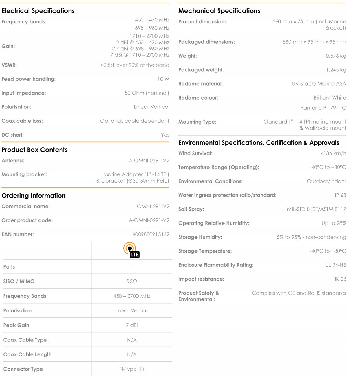 Omni-291-це високопродуктивна морська антена. Використовує стандартну 1-дюймову (14 TPI) морську ручку, яка, безумовно, спрощує установку. Ультра -ROK частотна діапазон включає всі сучасні робочі частоти LTE з відмінним стійким підкріпленням на всіх частотах, включаючи діапазони LTE та CDMA 450 МГц, які є типовими вимогами до морських застосувань. OMNI-291 гарантує прийом сигналу майже по всьому узбережжю, тому ви можете використовувати його у всіх куточках світу. Антени Poynting досягають цього завдяки новій конфігурації антени, використовуючи багато диполів та унікальну (запатентовану) мережу постачання. Антена - це майбутнє, оскільки вона підтримує частоту 450 МГц LTE, яка стає все більш популярною в різних регіонах та країнах!