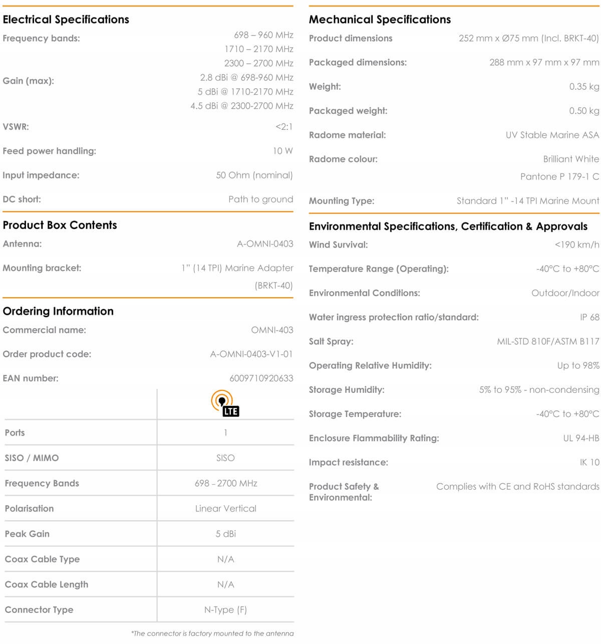 Omni-403-це широкосмугова антена LTE з низьким профілем кришки, яка була спеціально розроблена для несприятливих морських та прибережних умов. Ця антена включає всі сучасні робочі частоти LTE з ідеально збалансованим підкріпленням на всіх частотах, вдосконалюючи функції LTE, такі як агрегація багатьох опорних (CA). Ця антена підходить для всіх мереж 5G до 2700 МГц. Антена була розроблена для відмінного контролю візерунків у всьому діапазоні частот, завдяки якому OMNI-403 є унікальною антеною вдосконалення завдяки її розмірі та використанні. Антена досягає таких параметрів завдяки новій конструкції з використанням багатьох форсунок та унікальної (запатентованої) мережі живлення. Антена використовує стандартний 1-дюймовий (14TPI) море, що спрощує встановлення для більшості стандартних морських аксесуарів.
