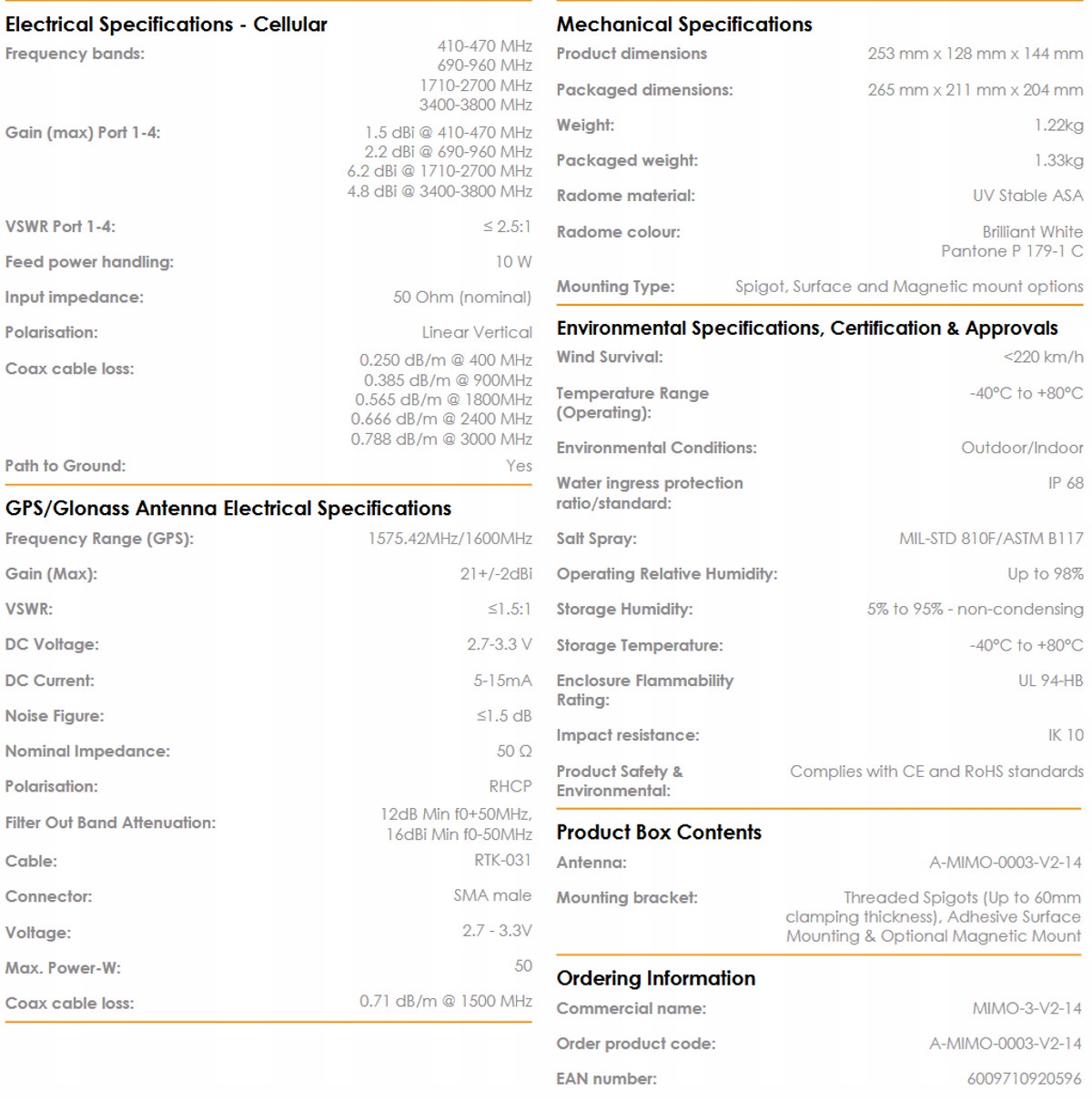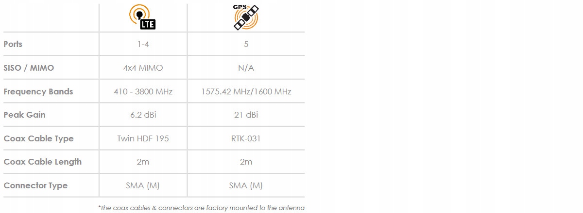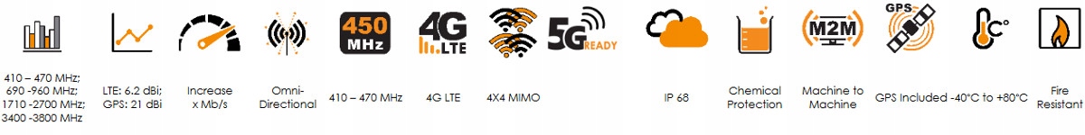 MIMO-3-14 — це високоефективна багаточастотна антена 5-в-1, що містить чотири стільникові антени та антену GPS/ГЛОНАСС. Чотири стільникові антени MIMO (для 2G/3G/4G) охоплюють сучасні діапазони від 690 МГц до 2700 МГц, а також новий спектр LTE і 5G для діапазонів CBRS 450 МГц і 3,5 ГГц, який стає популярним у різних міжнародних мережах телефонів LTE. Надширокосмугова продуктивність антени дозволяє використовувати її в різних операторах і технологіях, і вона готова до майбутнього для стільникових технологій до 3,8 ГГц для додатків 5G. П’ята антена — це високоефективна активна система GPS/ГЛОНАСС, яка працює при температурі до -40 ° C. MIMO-3-14 перевершує більшість конкурентів завдяки увазі до дизайну цієї високопродуктивної антени. Діаграми спрямованості всіх випромінювальних елементів забезпечують відмінний баланс між всеспрямованістю, різноманітністю діаграм і хорошими можливостями випромінювання на потрібній висоті. Це важливий критерій для транспортного та морського ринку. для яких антена була спеціально розроблена. Основні сфери застосування – це комерційні/промислові транспортні засоби, морські засоби, M2M та інші системи Інтернету речей, які використовують широкий спектр радіотехнологій, зберігаючи при цьому майбутнє в широкому діапазоні частот.