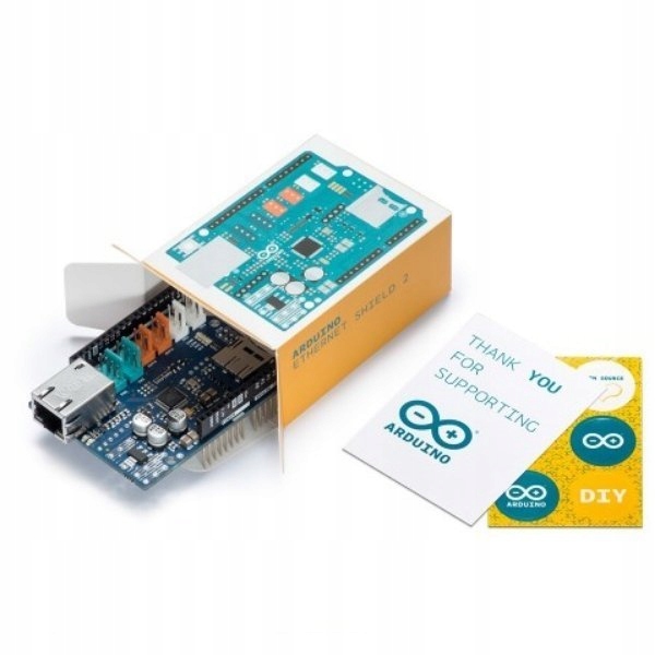 Ethernet 2 накладання дозволяє просте підключення до Інтернету. Модуль заснований на системі W5500. У накладці є зчитувач карт пам'яті Micro SD, який дозволяє зберігати більше даних. Окрім розетки Ethernet та зчитувача карт, пристрій має: роз'єми для модуля POE, шпильки Arduino, кнопка скидання, світлодіоди та додаткові розетки до шини комунікації, наприклад. P> щит сумісний з Arduino Uno та Mega. Він не підтримує Arduino Zero M0 Pro.