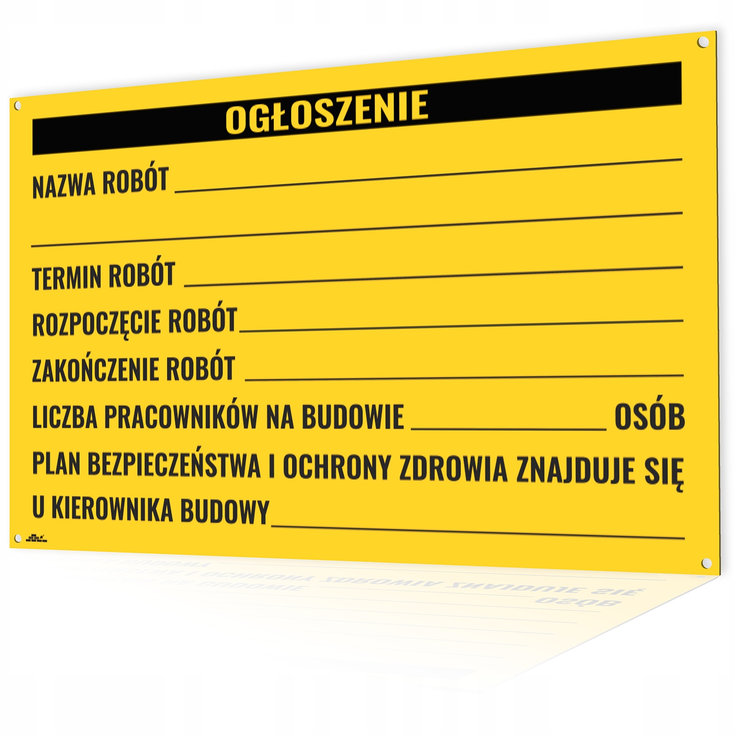 Дошка ПОВІДОМЛЕНЬ про будівництвобуде використана на будівельному майданчику. Це один з необхідних елементів при будівництві будинків, які потребують попереднього отримання дозволу на будівництво. Будівельний щит з оголошенням повинен бути розміщений на добре видному місці. Розміщення на фасаді будівлі, дверях чи огорожі – ефективний спосіб надати всю необхідну інформацію про будівельні роботи. Відсутність інформаційної дошки на будівельному майданчику може призвести до фінансового штрафу. Виразний принт і використання жовтого кольору дошки привертають увагу, роблячи дошку легко помітною.