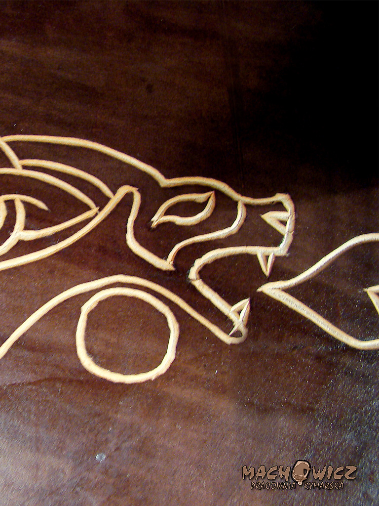 Круглий щит вікінга. Виготовлений з водостійкої фанери товщиною 10 мм. Лицьова частина обтягнута темно-коричневою заготівельною шкірою, на поверхні якої нанесено декоративне гравіювання, яке може бути виконано за індивідуальним бажанням замовника. Умба сталева, кована. Край щита укріплений шкіряною смугою. Всі елементи кріпляться сталевими заклепками на латунних шайбах. Тильна сторона щита покрита спилом. Ручки щита з щільної чистої шкіри.