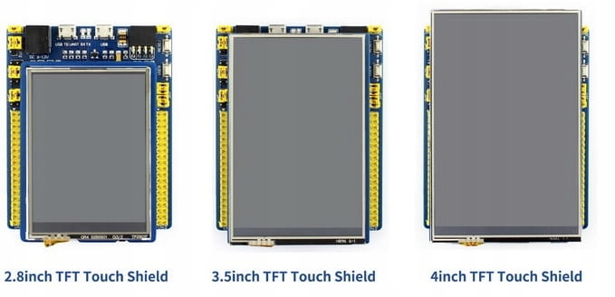 Код продукту Драйвер Сенсорний контролер Роздільна здатність Розміри дисплея (мм) Зовнішні розміри (мм) 2,8 дюйма TFT Touch Shield ST7789 XPT2046 320x240 57,6 x 43,2 73,3 x 55,3 3,5 дюйма TFT Touch Shield ILI9486 XPT2046 480x320 74,2 x 4 9,8 86,0 x 57,2 4 дюйма TFT Touch Щит ILI9486 XPT2046 480x320 84,3 x 56,5 95,0 x 62,0