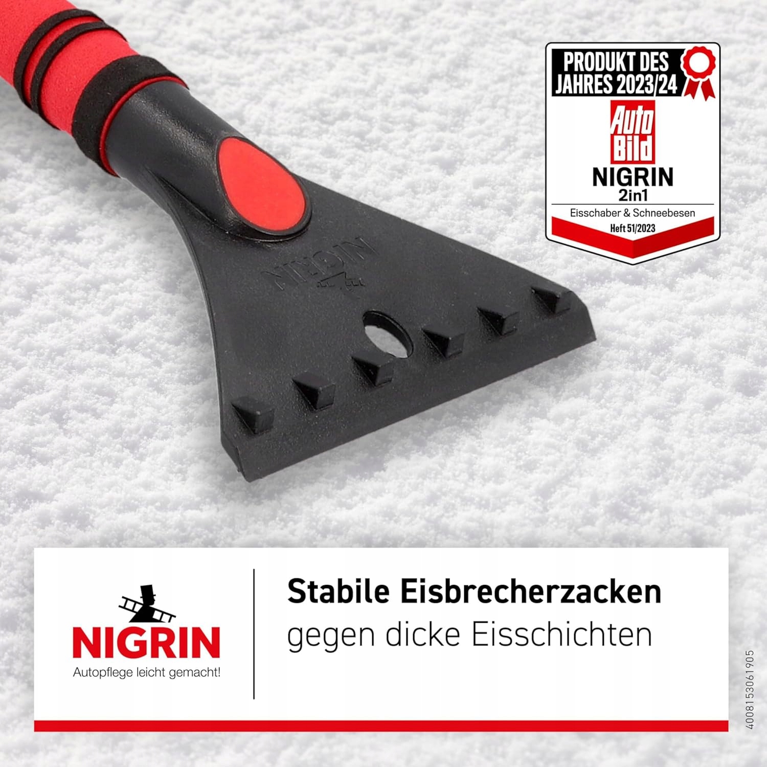 Багатофункціональна щітка Nigrin поєднує в собі скребок для льоду та снігобій, що робить зимовий ранок легшим і швидшим. Він легко видаляє лід, іній і сніг з вікон, даху і кузова, забезпечуючи повну видимість і безпеку на дорозі 🌨️.