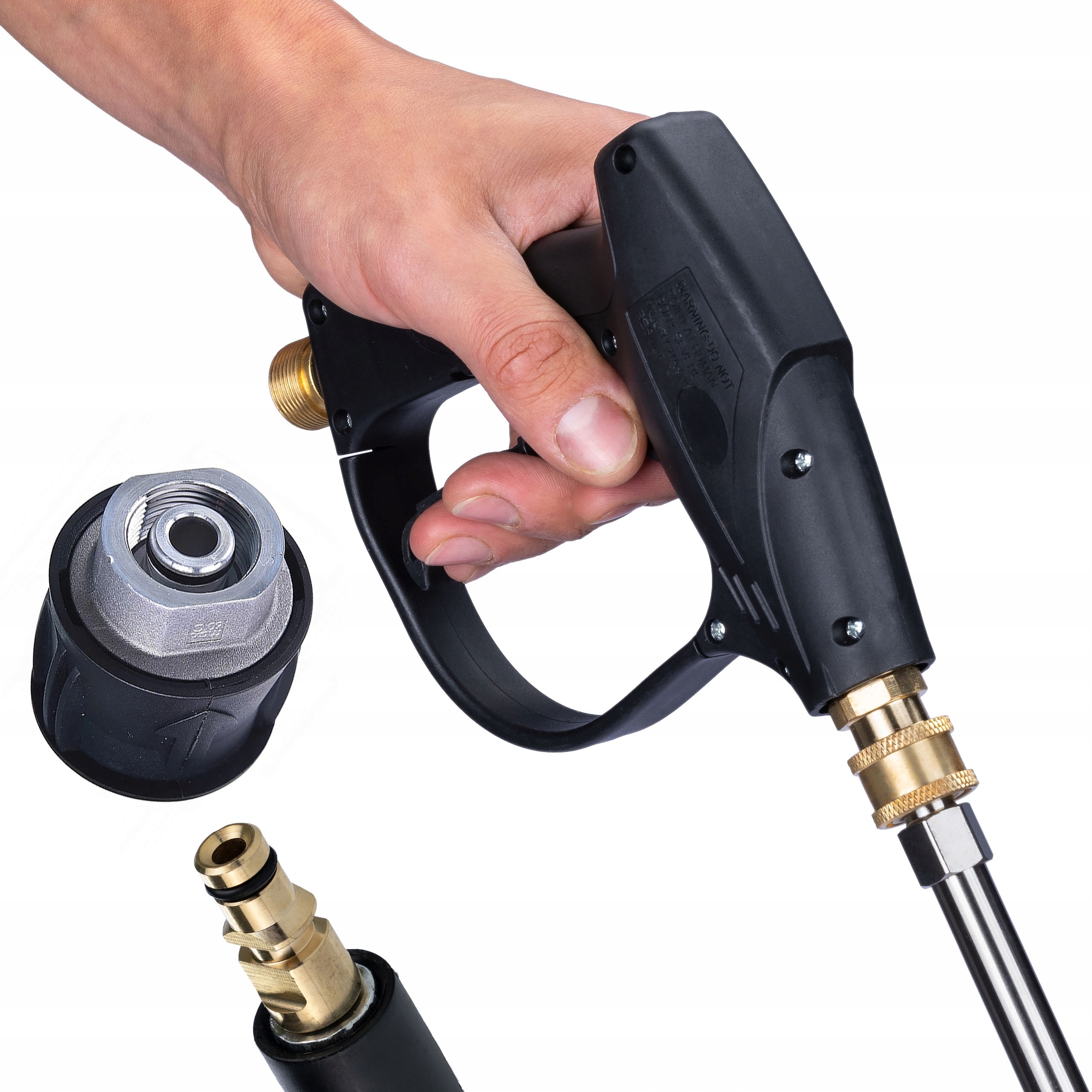 ✅ Швидкий роз’єм: Пистолет оснащено вихідним швидким роз’ємом діаметром 1/4 дюйма та різьбовим вхідним роз’ємом M22-14 (зовнішній діаметр 22 мм, внутрішній діаметр 14 мм). Це забезпечує легке та надійне під’єднання до мийки високого тиску.