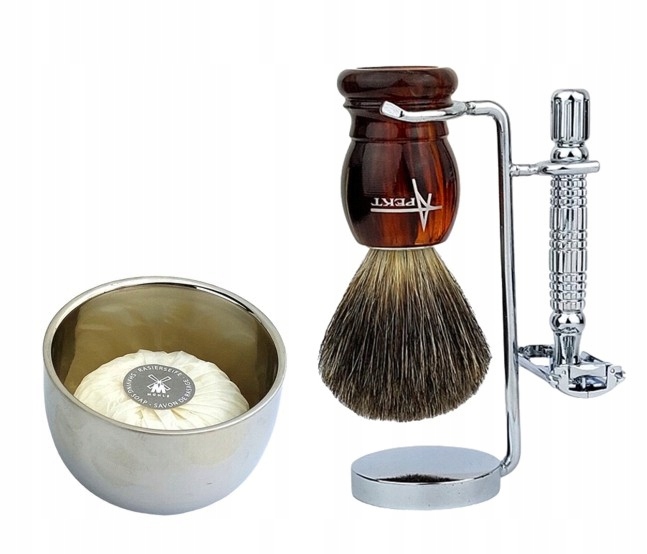 Елегантний набір для гоління з щіткою для борсукової шерсті, металевою бритвою, підставкою та фірмовим милом для гоління в металевому тиглі від Apekt ;