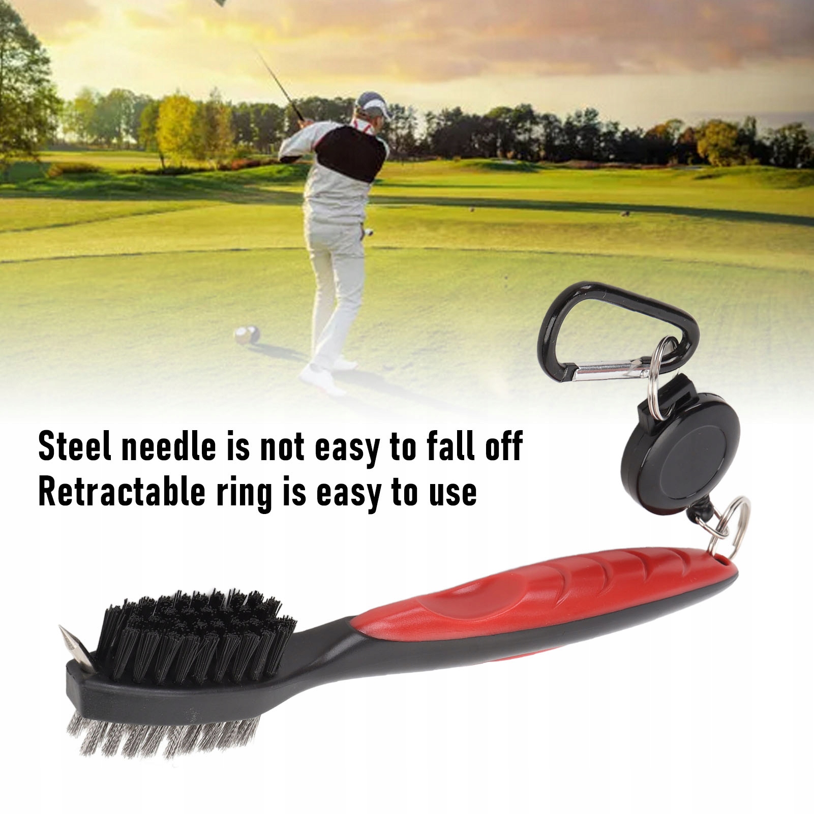 1. Подвійна конструкція для глибокого очищення: щітка для ключки для гольфу має подвійну стінку. Одна сторона оснащена твердими сталевими голками для ефективного видалення стійкого бруду та сміття з канавок ключки, а інша сторона використовує м’який віск для обережного змітання пилу з поверхні.