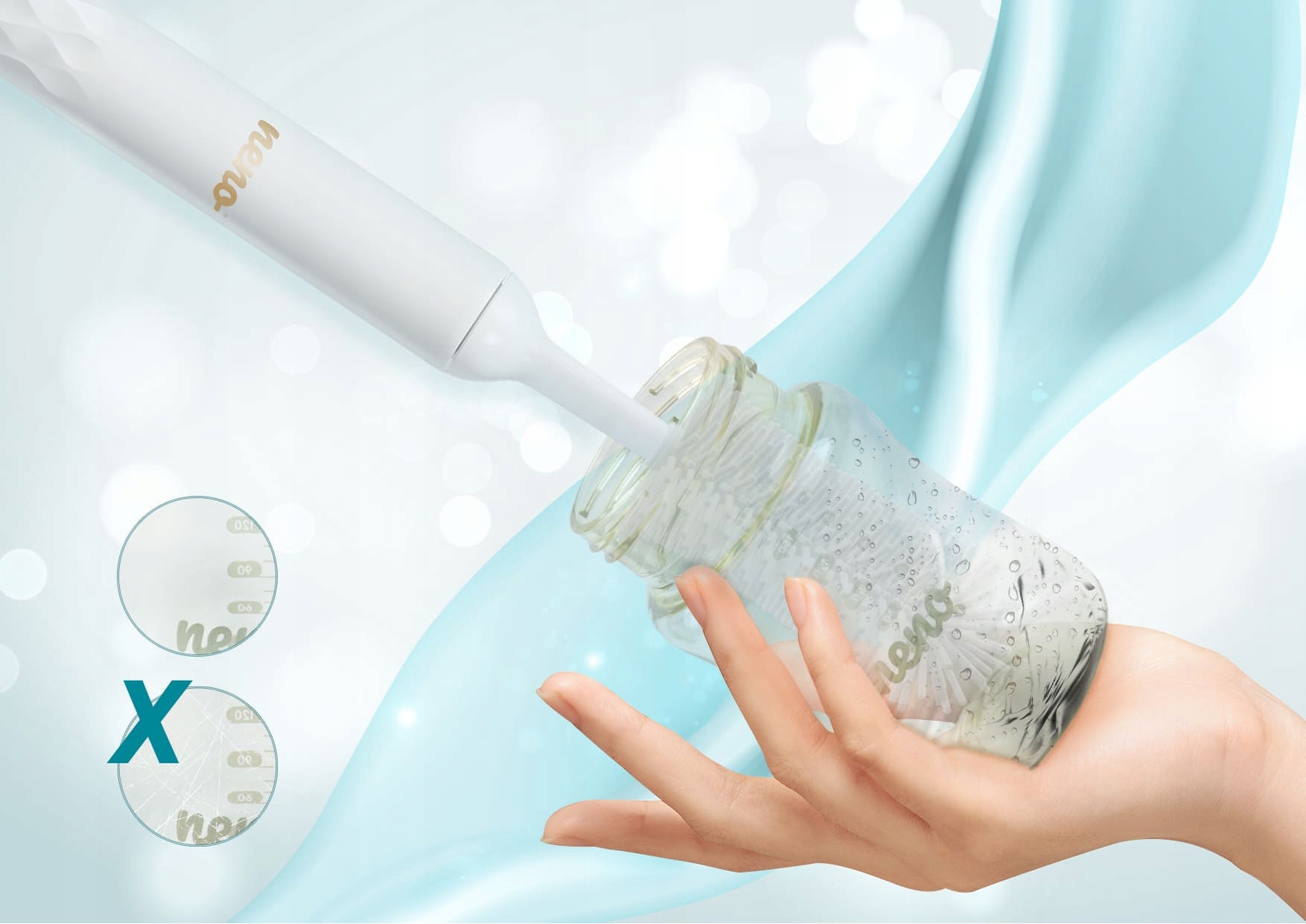 Бактерії - найлютіший ворог батьків і малюків. Ми знали це давно, тому ми розробили Neno Lavar, щоб мінімізувати ризик накопичення шкідливих мікроорганізмів на поверхні. Можливість швидкого миття силіконових елементів дозволяє щодня використовувати щітку гігієнічно. Точні та обертові насадки швидко очистять навіть важкодоступні куточки, не подряпавши пляшку.