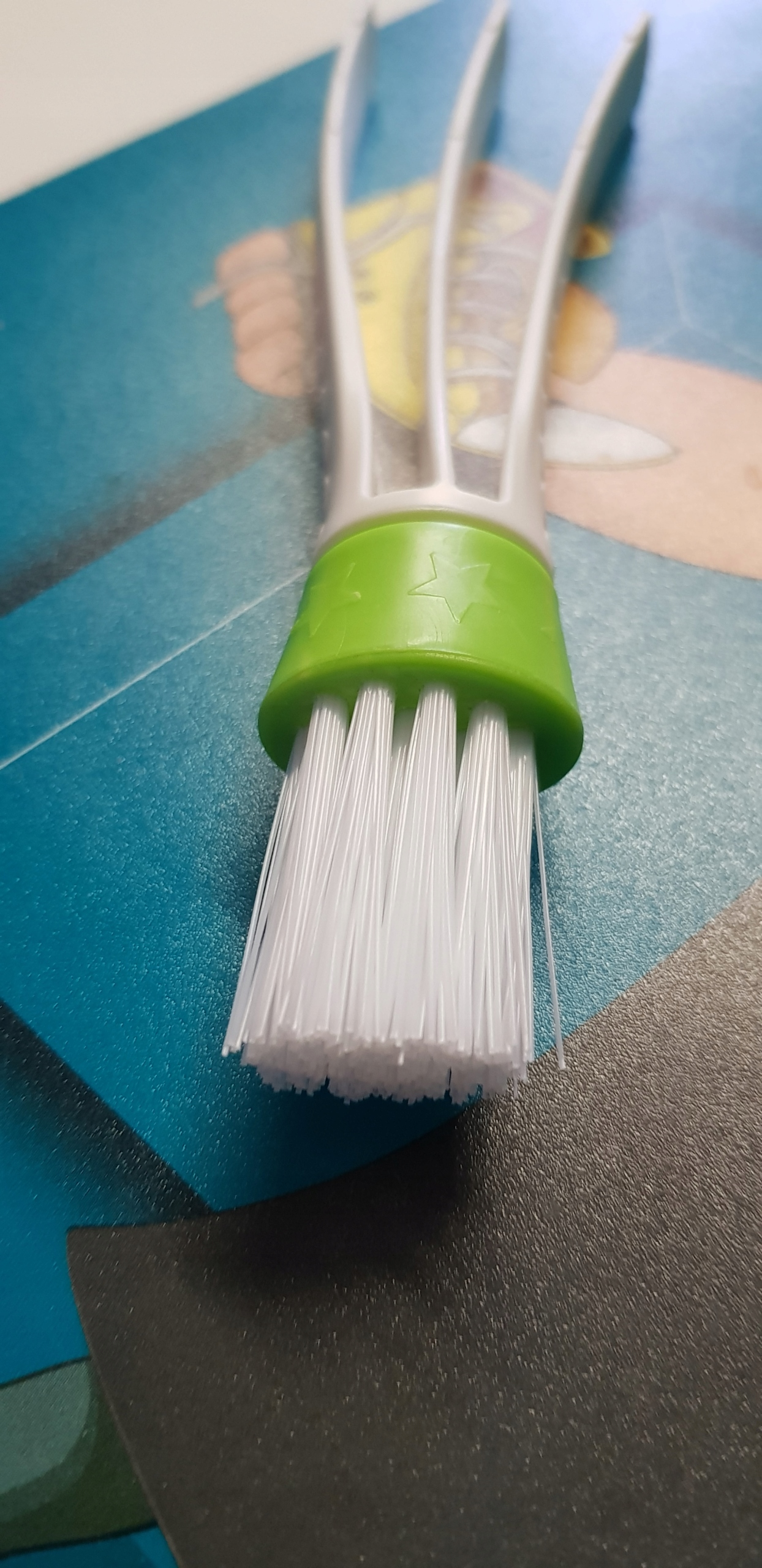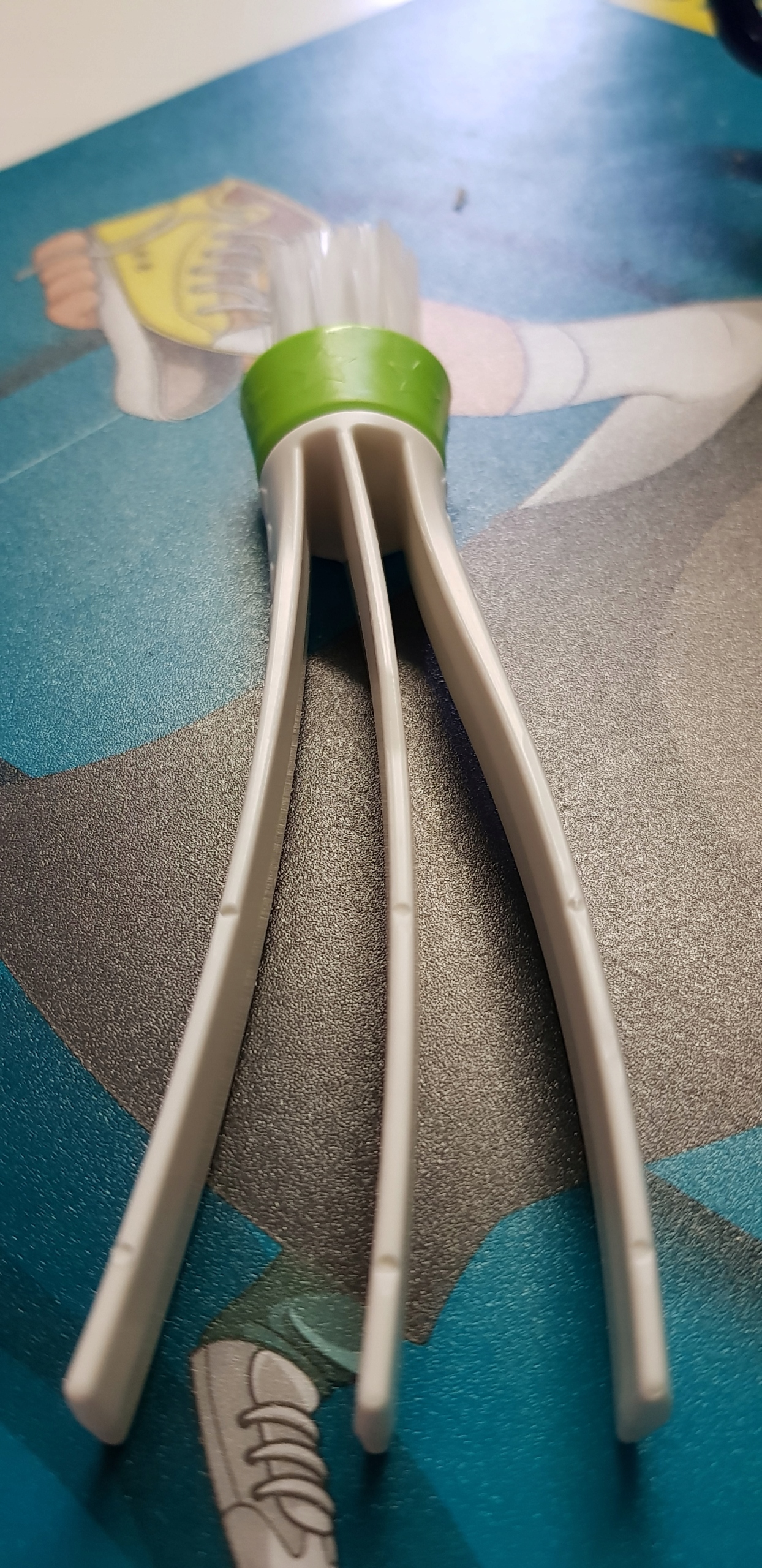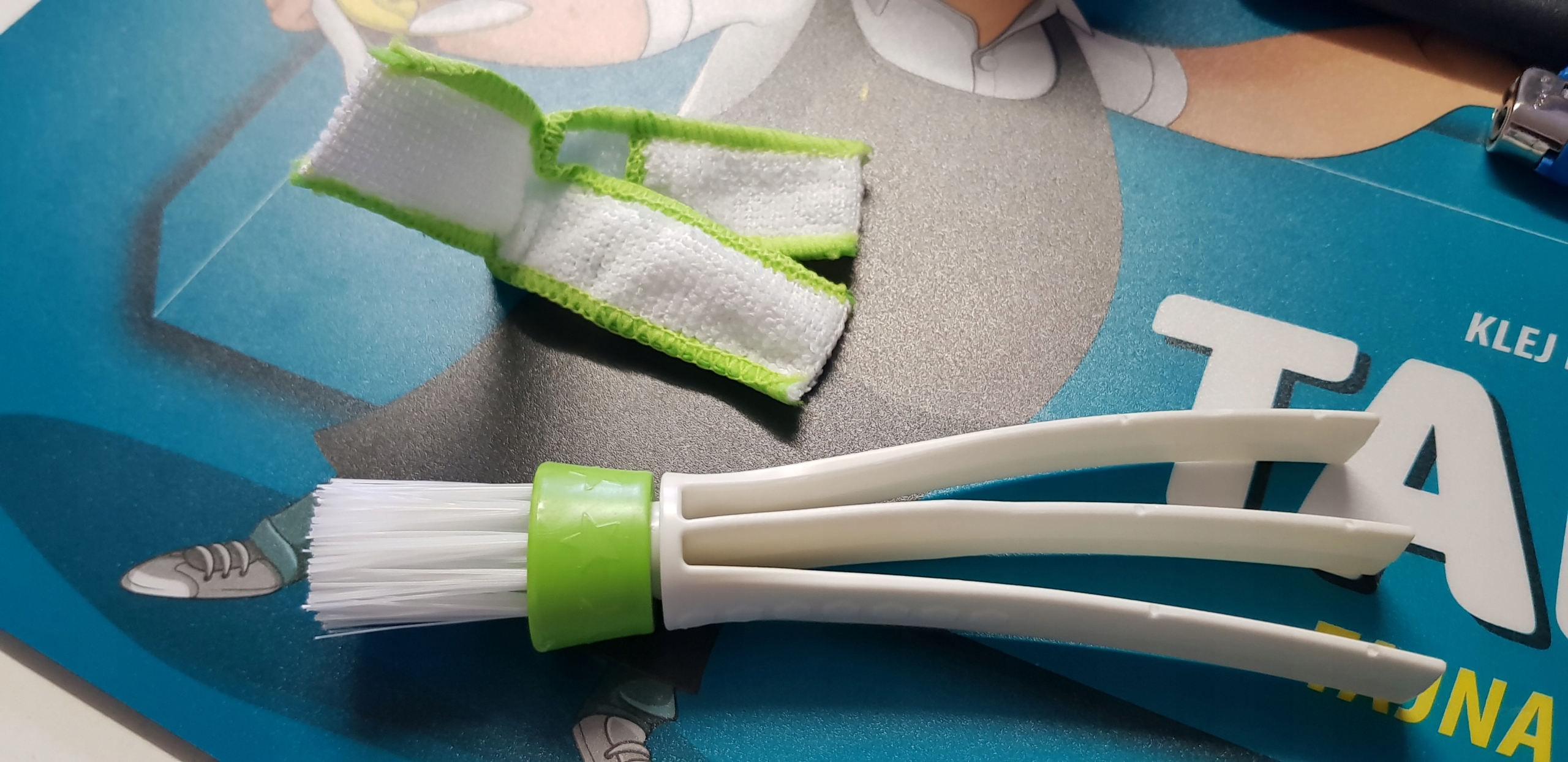 На з одного боку жорсткий очищувач зі щетиною, а з іншого м'яка тканина, прикріплена до потрійного кронштейна.