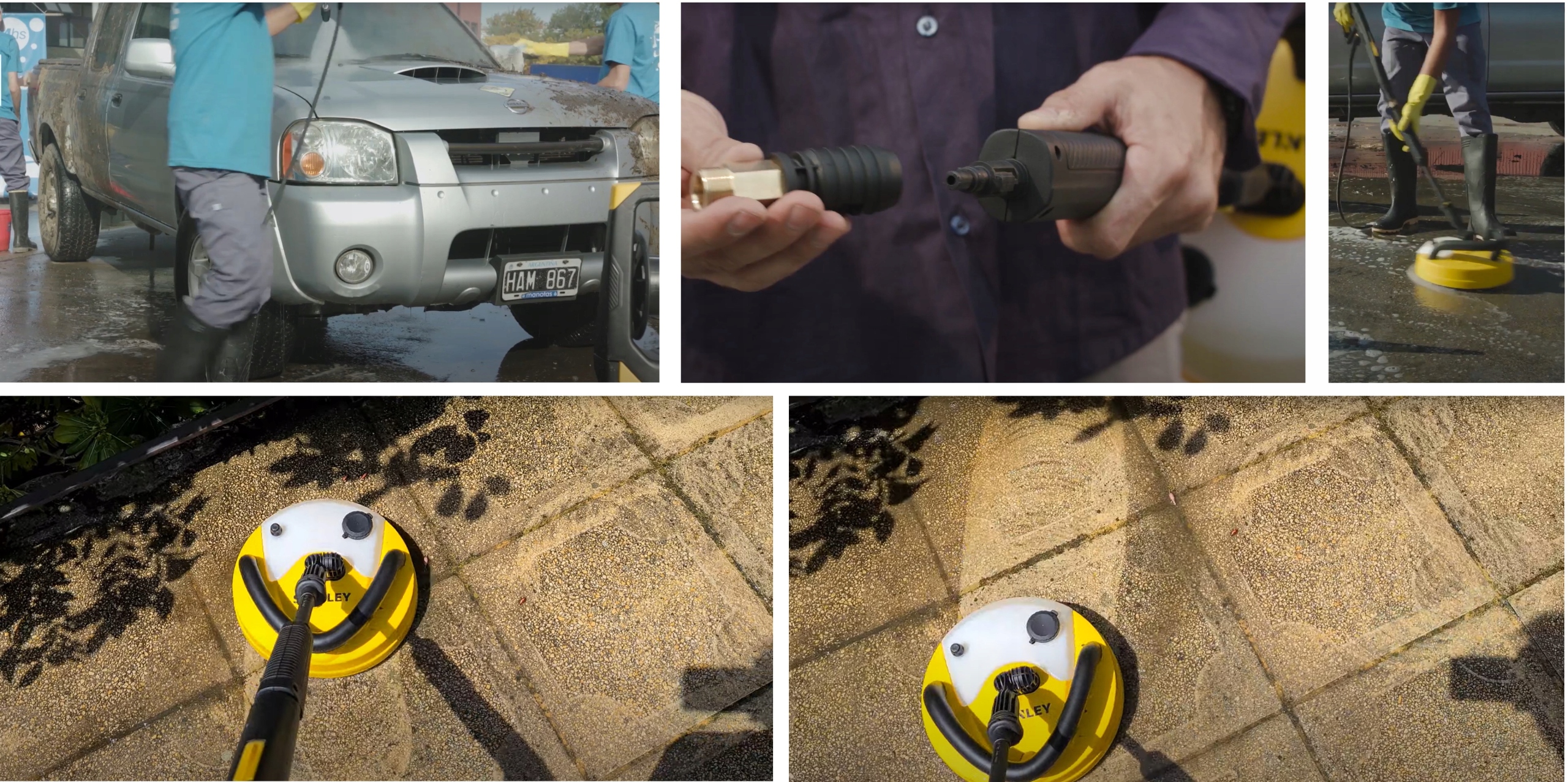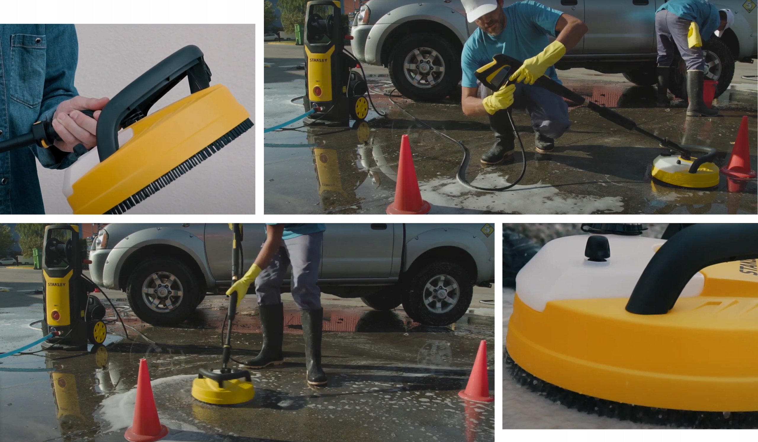 Насадка патіо для швидкого та ефективного очищення плоских поверхонь. Дві плоскі насадки, встановлені на обертовому пропелері, підвищують ефективність очищення до 10разів, а корпус ефективно захищає від бризок води. Зручні ручки дозволяють чистити вертикальні поверхні, такі як двері гаража, стіни або паркан.