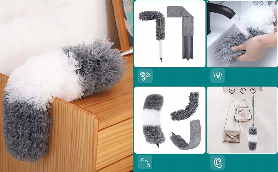 Головка пилу з мікрофібри гнучка 360°< /b > і можна згинати під будь-яким кутом, тож ви можете легко витирати невеликі тріщини чи приховані ділянки з усіх куточків вашого дому та захистити меблі та стелю від подряпин.