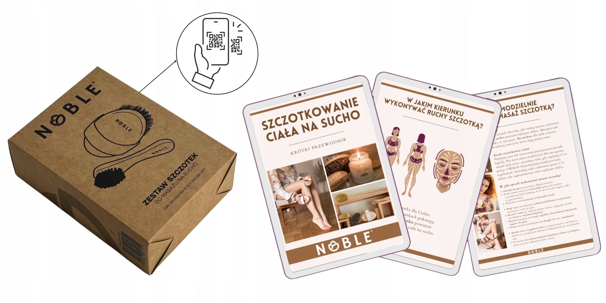 Посібник з чищення та типи сухих щіток масажу сухих Noble®. Ви можете отримати додаткову інформацію, скануючи QR -код із упаковки пензля - завантажте електронну версію посібника виробника про те, як чистити тіло та вибрати потрібну пензлик для кожної частини тіла.