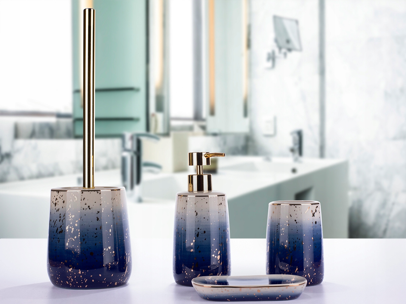 Щітка для туалету KAIR синьо-білого кольору із золотою позолотою. Практичне доповнення до туалету, яке підходить до класичних і сучасних інтер'єрів. Висока якість виконання
