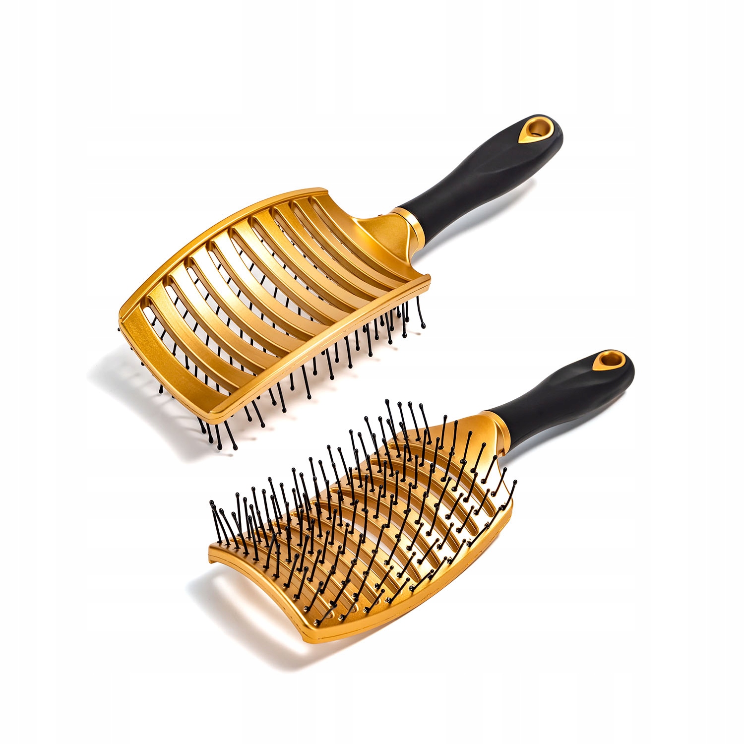 Вигнута щітка з вентильованим дизайном, яка прискорює висихання та захищає волосся від тепла. Гнучкі зубці з кульками на кінцях ніжно масажують шкіру голови, розплутуючи волосся, не смикаючи. Нековзна ручка забезпечує комфорт, а елегантний золотий дизайн додає стилю. Ідеально підходить для щоденного використання та стилізації.