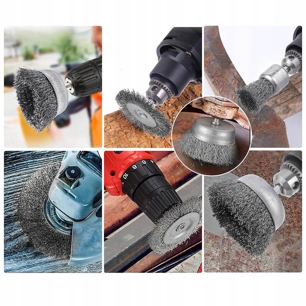 Включає 3 різні типи дротяних щіток і свердел: 8 Т-подібних плоских щіток, 3 щітки у формі чаші та 3 щітки у формі пера. Примітка: для безпеки надягайте захисну маску під час використання дротяних свердел.