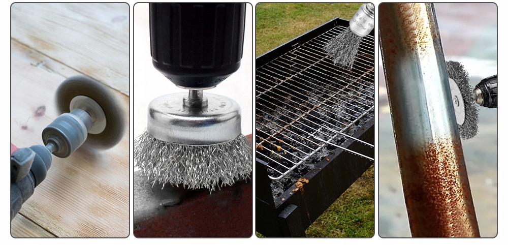Дротяні щітки можна використовувати для видалення іржі, полірування, догляду за деталями, обробки пофарбованих поверхонь, покриття, шліфування, зварювання, видалення задирок, очищення корпусу та паливного бака тощо.