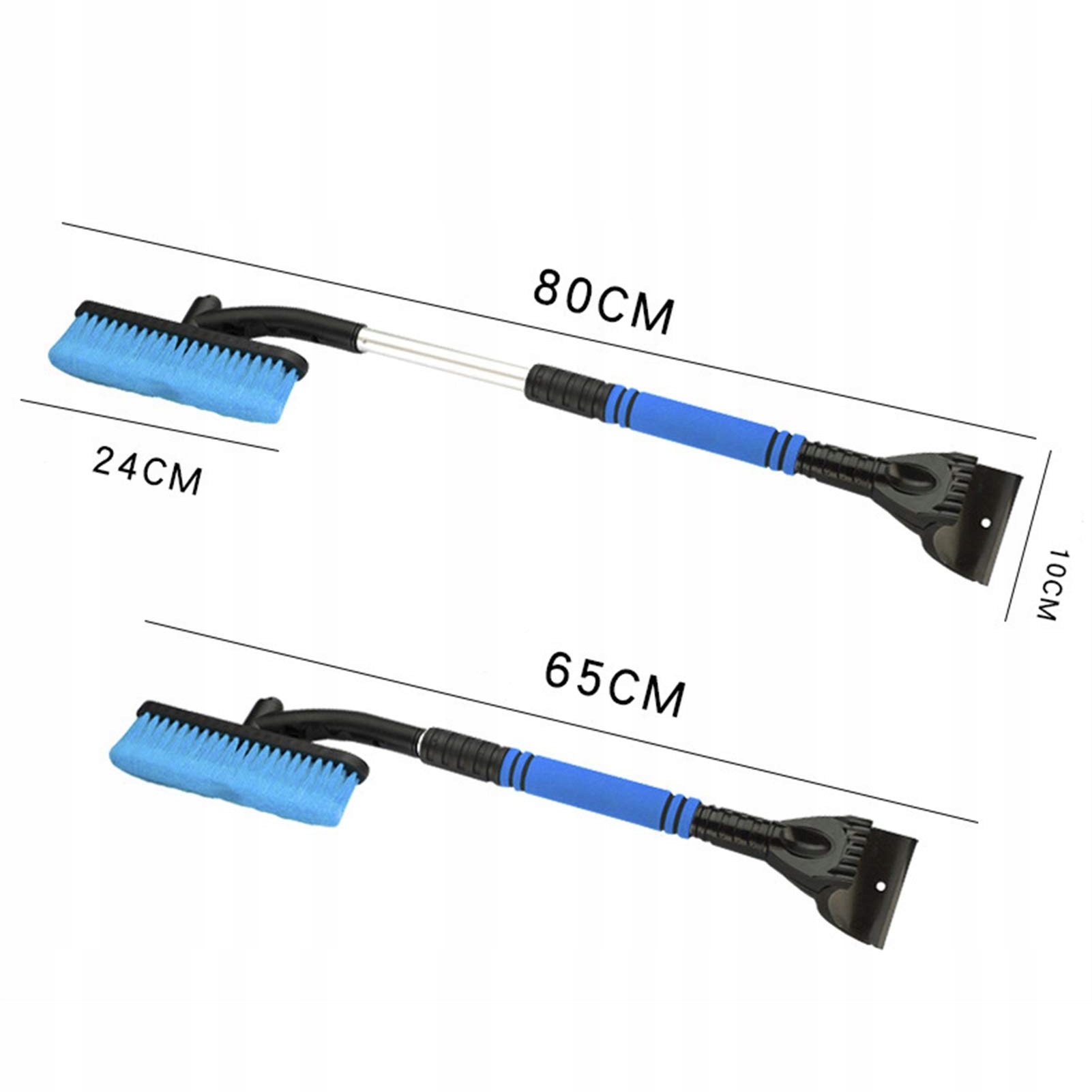 - Мінімальна довжина скреба для снігу 2 в 1 становить приблизно 65 см, а максимальна довжина – приблизно 80 см, легко дістатися до лобового скла чи центру даху.