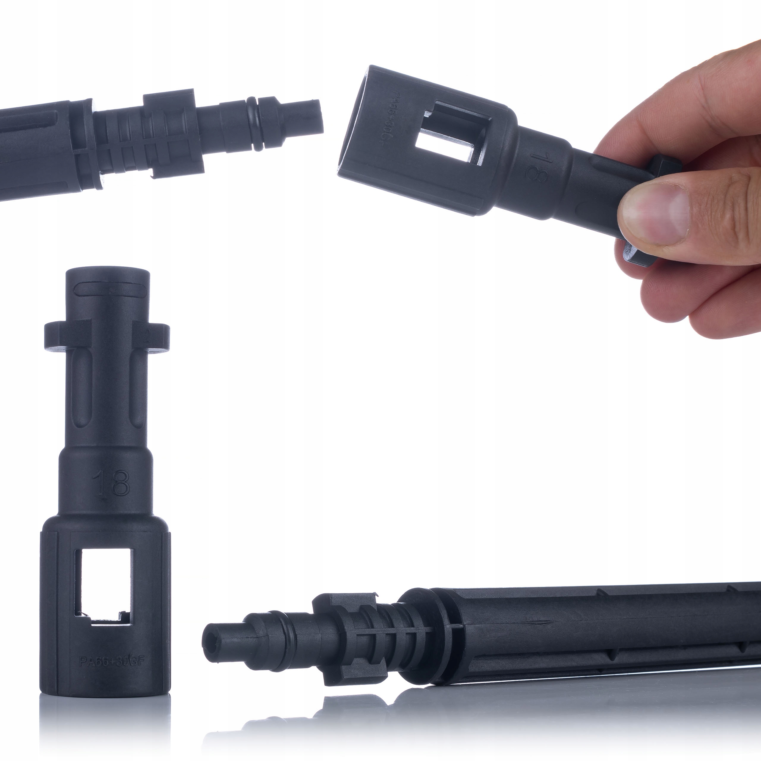 Набір оснащений додатковим байонетним адаптером Black & Decker, який дозволяє підключати мийні машини Black & Decker, VAX і Bosch AQT до пістолета замість наконечника.