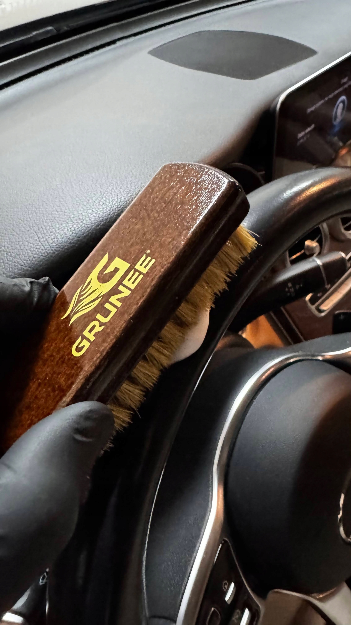 Виготовлена з високоякісної деревини бука, має м’яку щетину, яка ідеально підходить для видалення бруду з усіх типів шкіри, як в автомобілі, так і вдома, не дряпаючи поверхню шкіри та не вступаючи в реакцію з іншими продуктами GRUNEE.