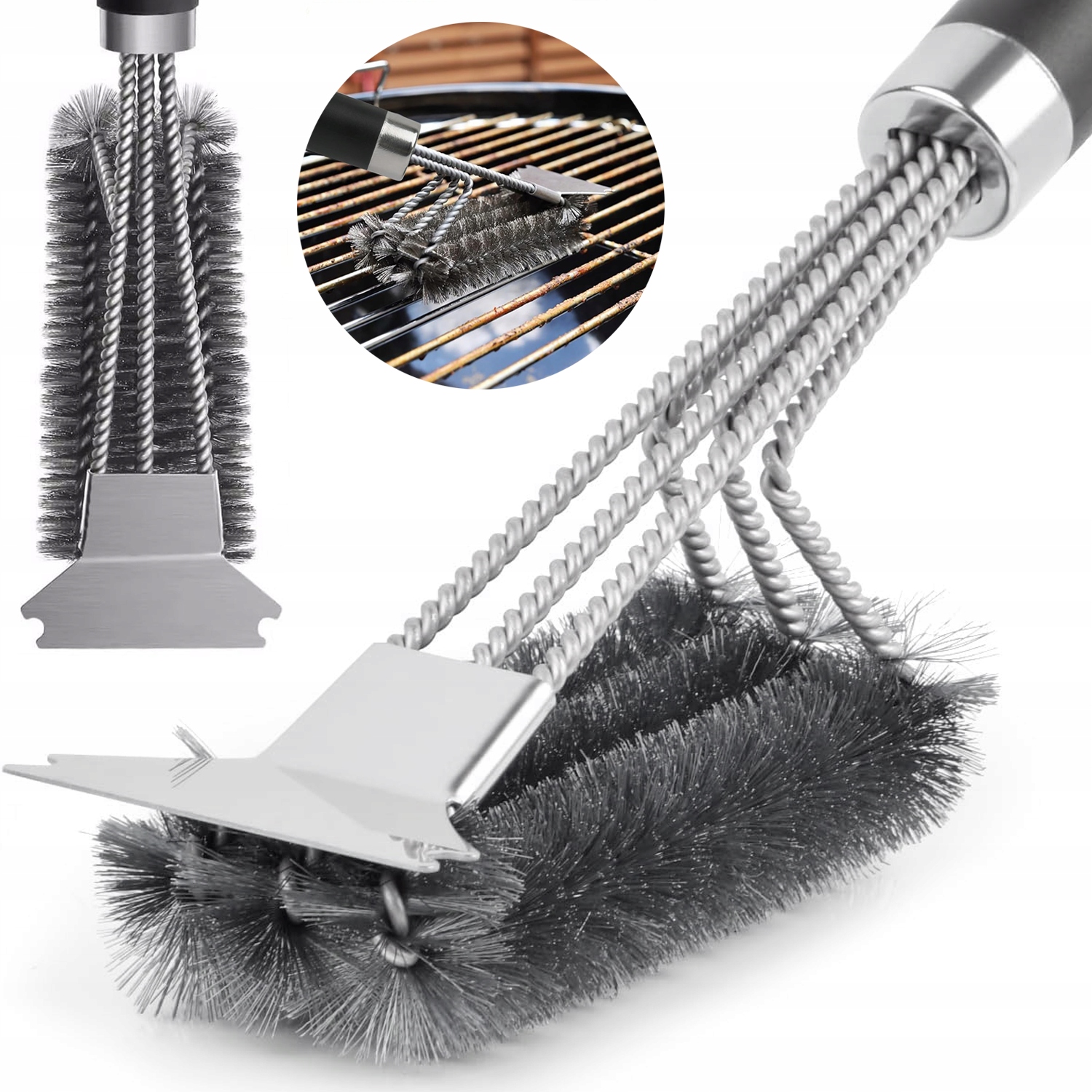Щітка для гриля 3 в 1 зі скребком із нержавіючої сталі та знімною ручкою з поліпропілену дозволяє швидко, чисто та зручно очищати решітку - до 5 разів швидше, ніж за допомогою звичайної щітки. Довговічний, ергономічний і універсальний - замовте зараз і попрощайтеся з впертими опіками!
