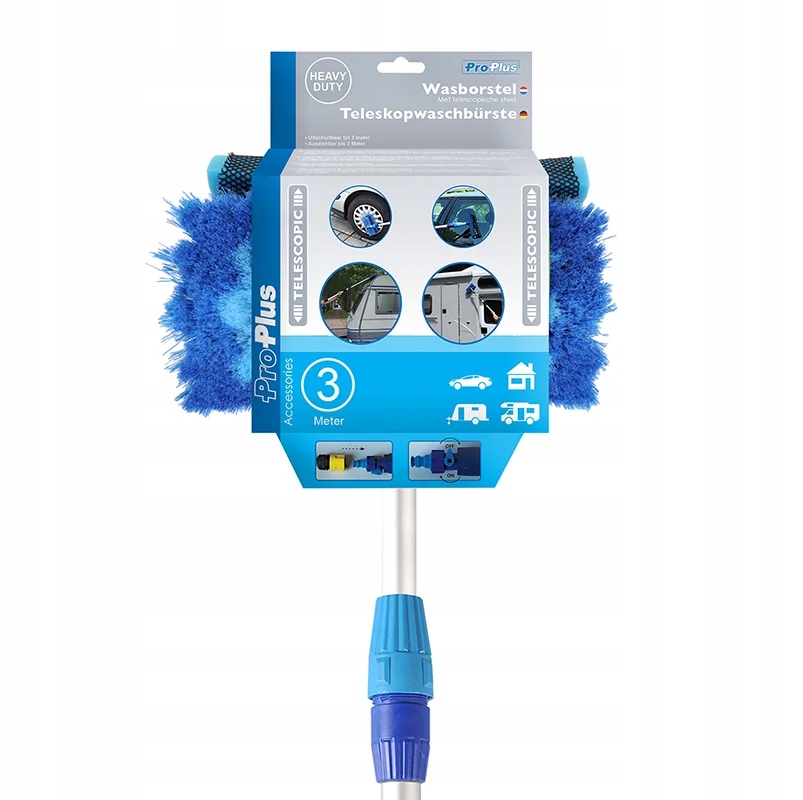 Телескопічна щітка з висувною алюмінієвою паличкою, призначена для роботи в місцях, де потрібен хороший доступ. Телескопічна палиця має різьбовий редуктор з одного боку і пластикову ручку з іншого і роз'єм з краном для підключення води. Телескопічну палицю можна зафіксувати в будь-якому положенні.