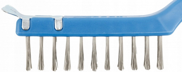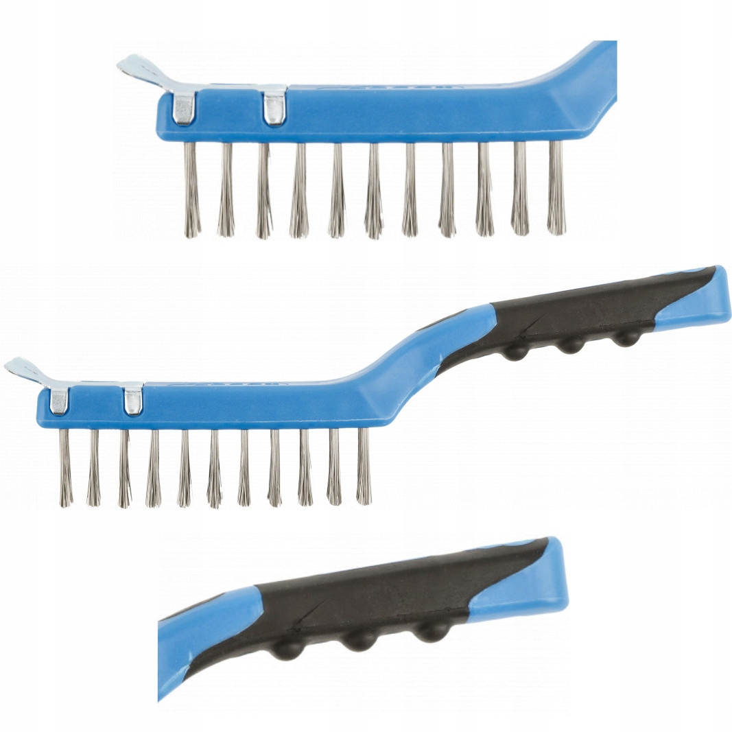 Щітка призначена для видалення фарб, лаків, зварних швів і бруду переважно з поверхонь з нержавіючої сталі. Робота полегшується та прискорюється завдяки твердому пластиковому скребку, розміщеному на кінці головки. Щітка виготовлена з нержавіючої, гнучкої сталевої дроту INOX, постійно закріпленої в пластиковому корпусі. Рукоятка профільована для зручності утримання інструменту та підвищення ефективності очищення.