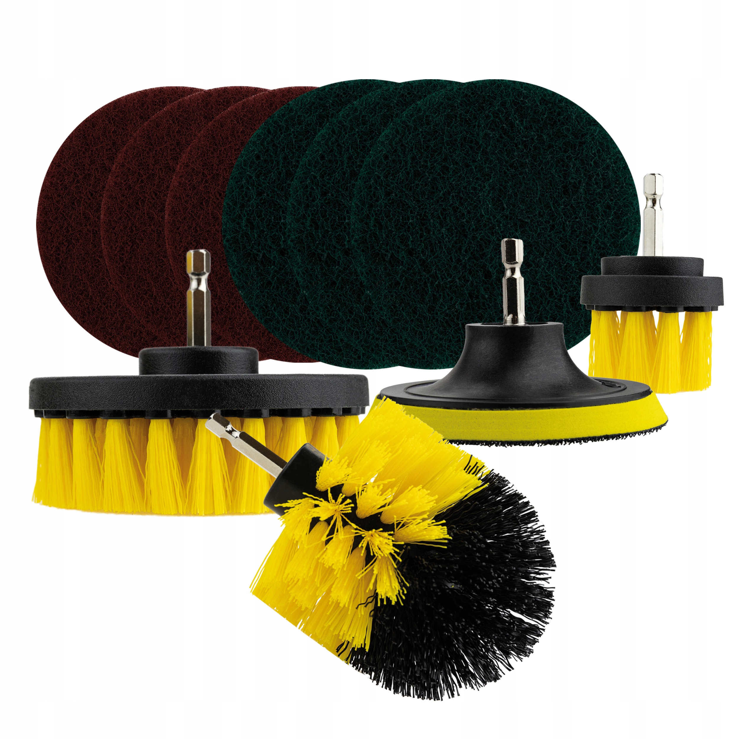 Щітки, оснащені тримачем 1/4'' HEX, які сумісні з дрилями, дрилями та викрутками. Щітки виготовлені з високоякісного матеріалу - PP середньої жорсткості, що гарантує довговічність і ефективність і запобігає розповзанню щетини в сторони під час роботи. Щітки сумісні з хімічними миючими засобами.