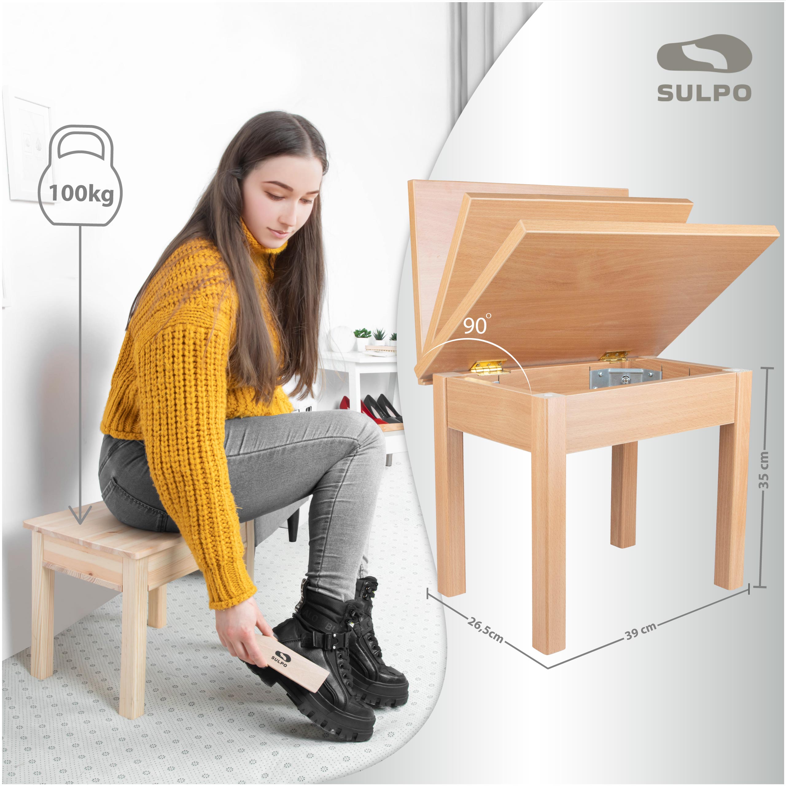 Унікальний SULPO набір для взуття не тільки естетичний, але й функціональний. Він може виступати як сидіння, підніжка, столик або навіть декоративний елемент ВАШОГО інтер'єру. З набором щіток SULPO ваше взуття завжди виглядатиме як нове. Насолоджуйтеся первозданним виглядом свого взуття протягом багатьох років. Якість і елегантність в одному наборі.