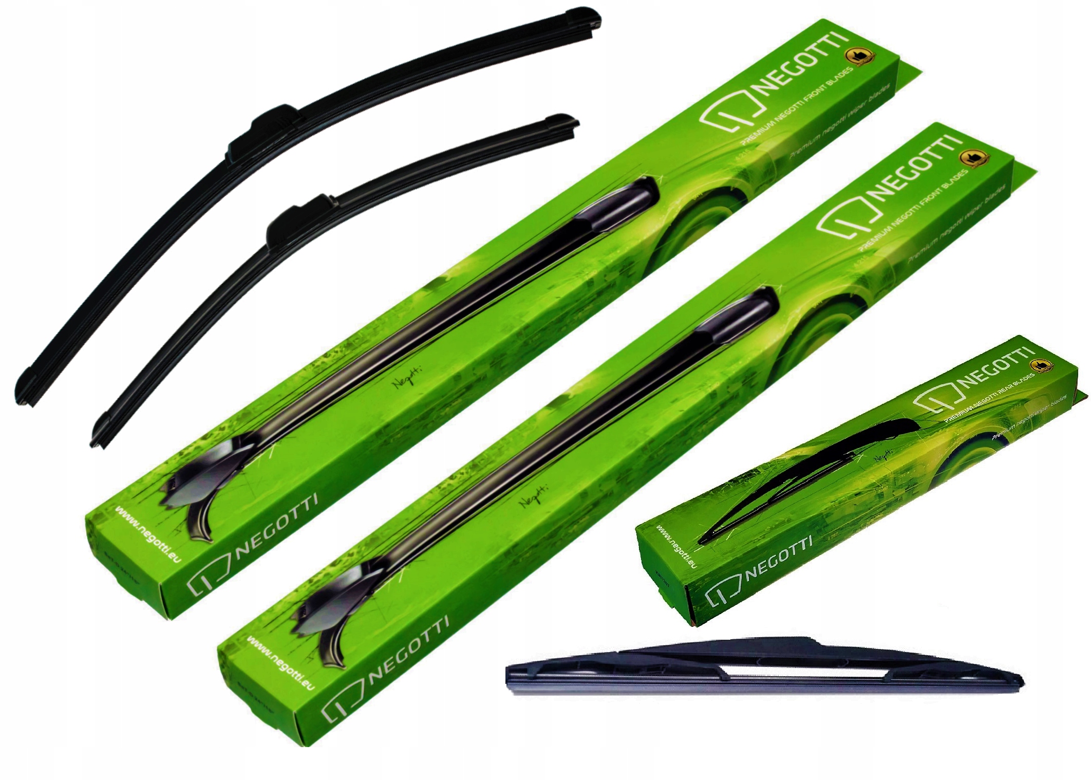 Плоскі щітки склоочисника Negotti. У набір входить набір спеціальних автомобільних склоочисників (3 шт., передній лівий і правий + задні) з кріпленням для заводських важіль.