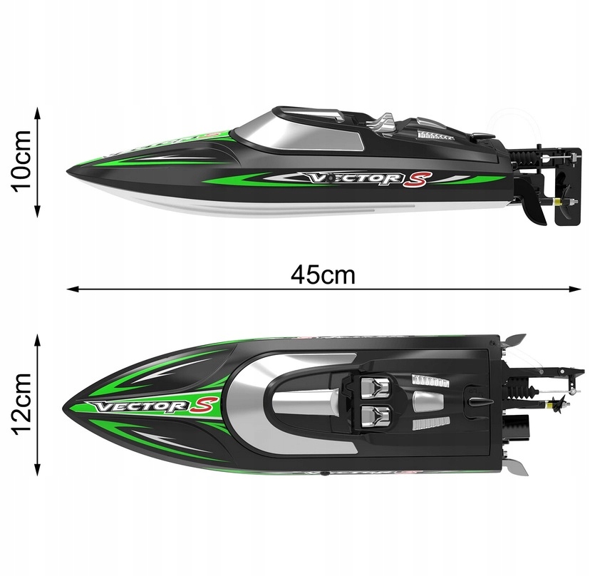 Човен Vector S повністю готовий до експлуатації і включає 2-канальне радіо за технологією 2,4 ГГц, потужний щітковий двигун. Що ще важливіше, він оснащений структурою автоматичного реверсу, що дає вам більше впевненості під час плавання на високій швидкості.