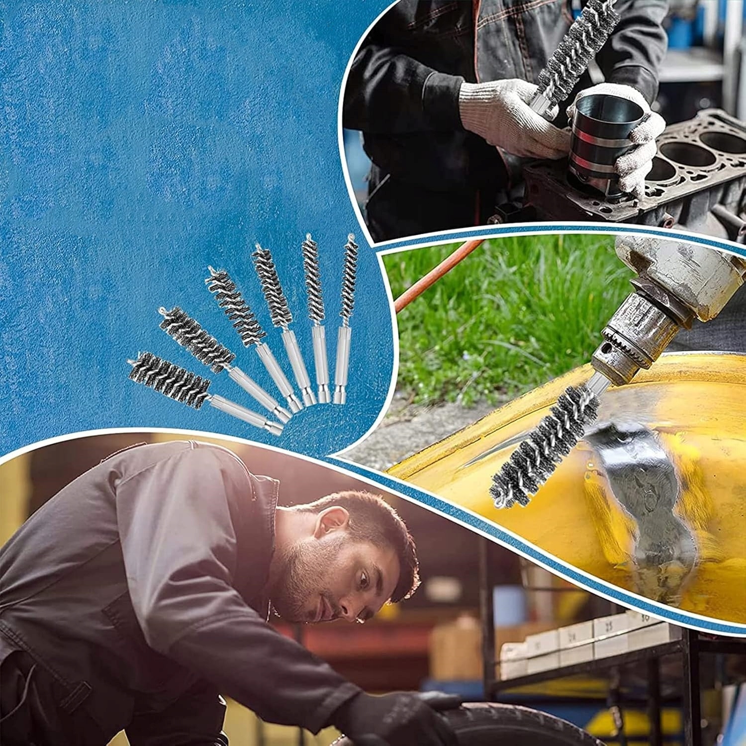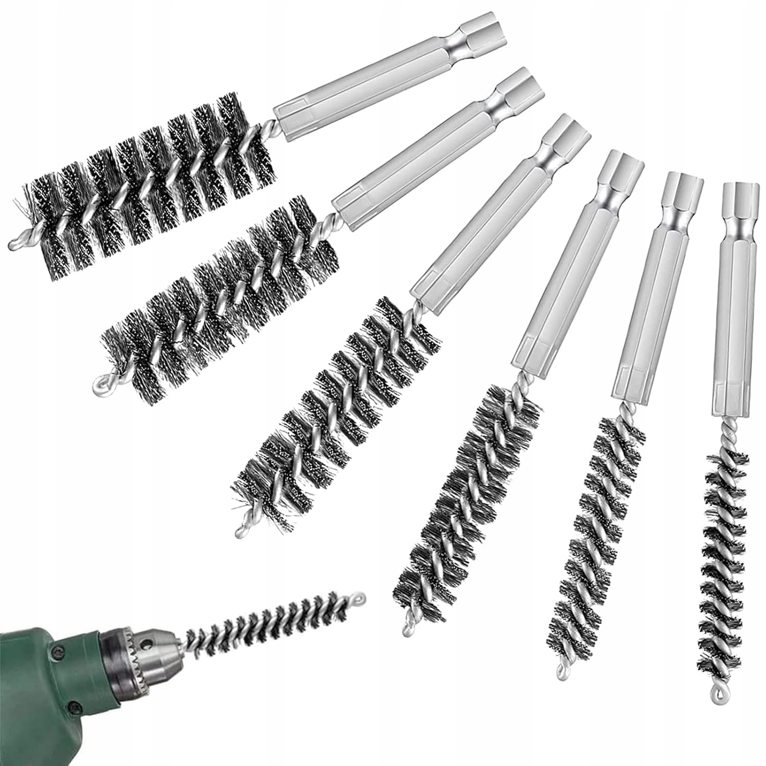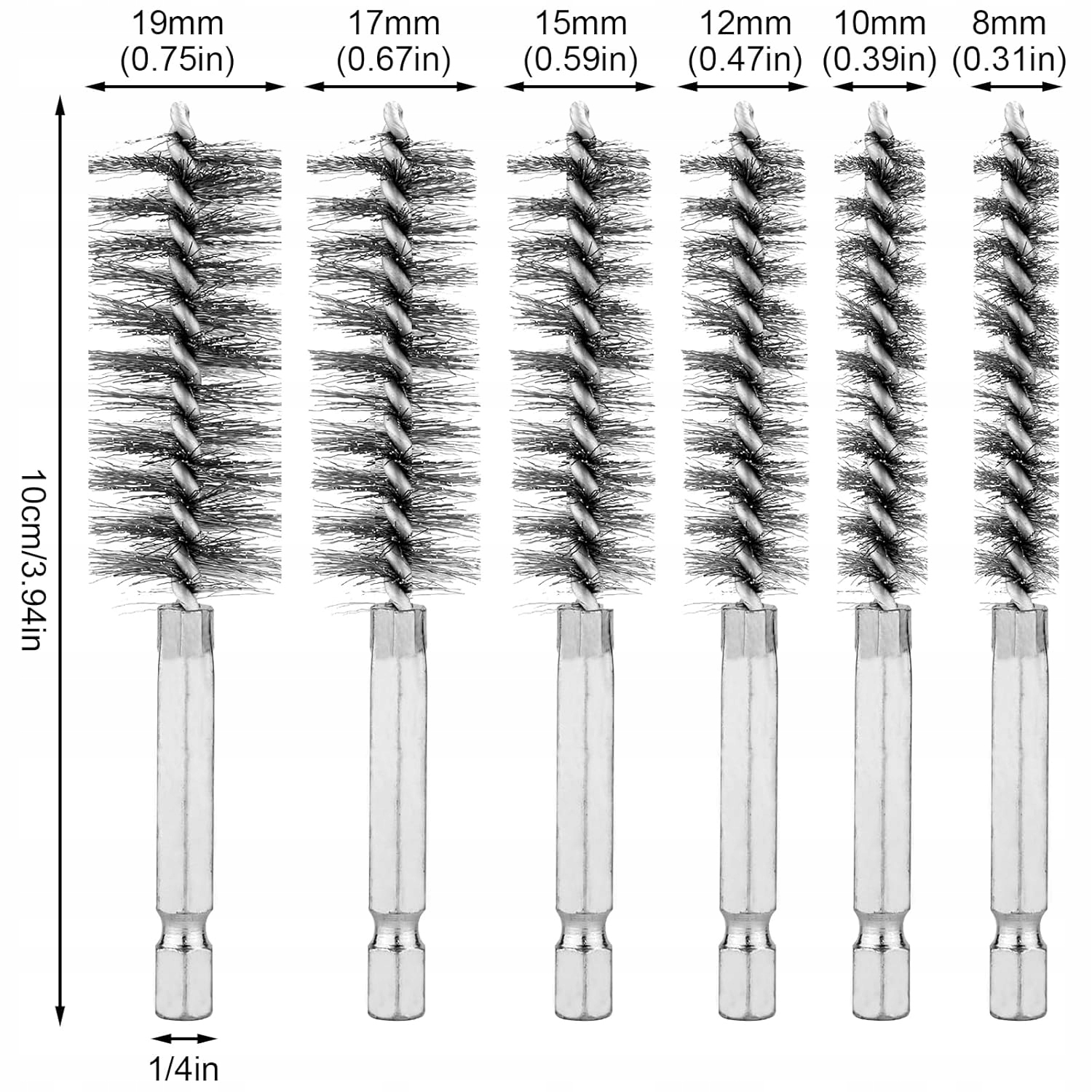 - включаючи діаметри 8 мм, 10 мм, 12 мм, 15 мм, 17 мм і 19 мм; кожна щітка має довжину 10 см і має шестикутну ручку 1/4 дюйма, яка кріпиться до будь-якого дриля чи шліфувальної машини (не входить до комплекту)