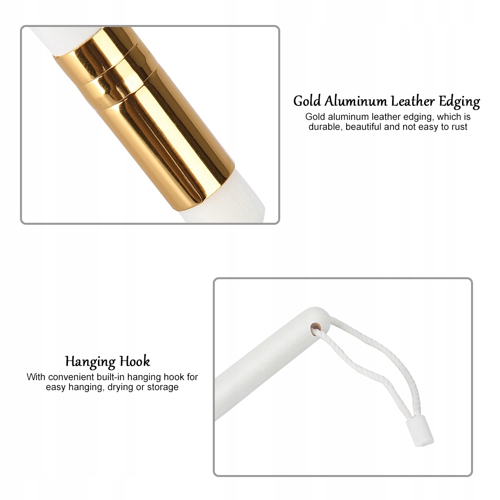 3. Золотий алюмінієвий шкірний кордон, який є міцним, красивим і нелегким для іржі. З зручним вбудованим гачком для легкого призупинення, сушіння або зберігання. Світло і компактний, зручний для перенесення. Золота щітка для очищення вія