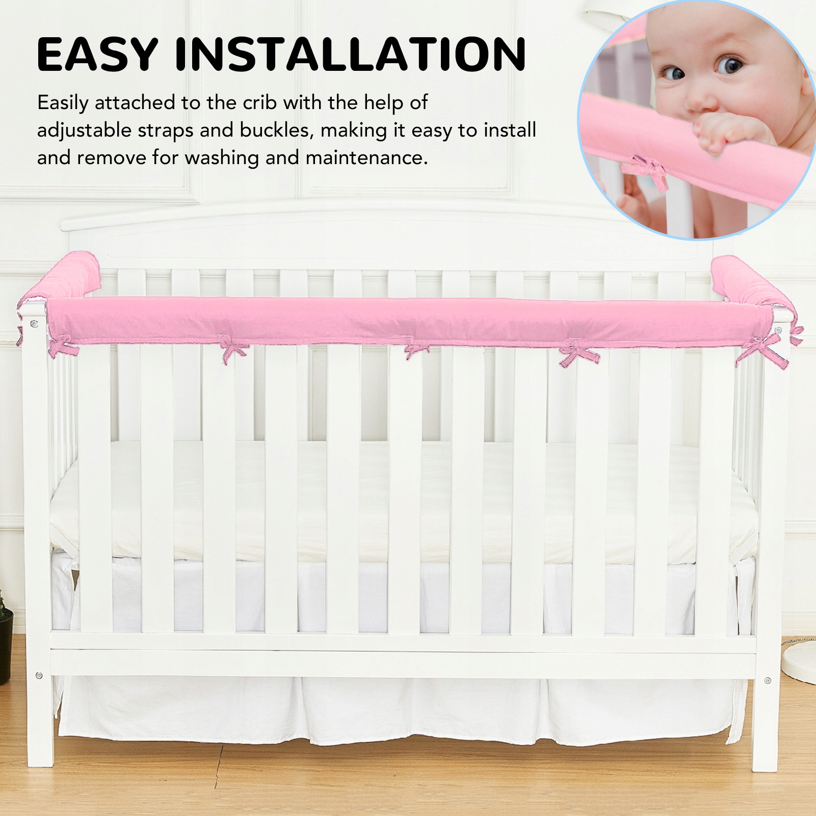 2. ПРОСТЕ ВСТАНОВЛЕННЯ: легко кріпиться до ліжечка за допомогою регульованих ременів і пряжок, що дозволяє легко встановлювати та знімати для прання та обслуговування.