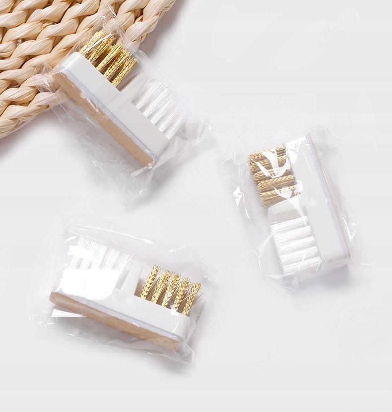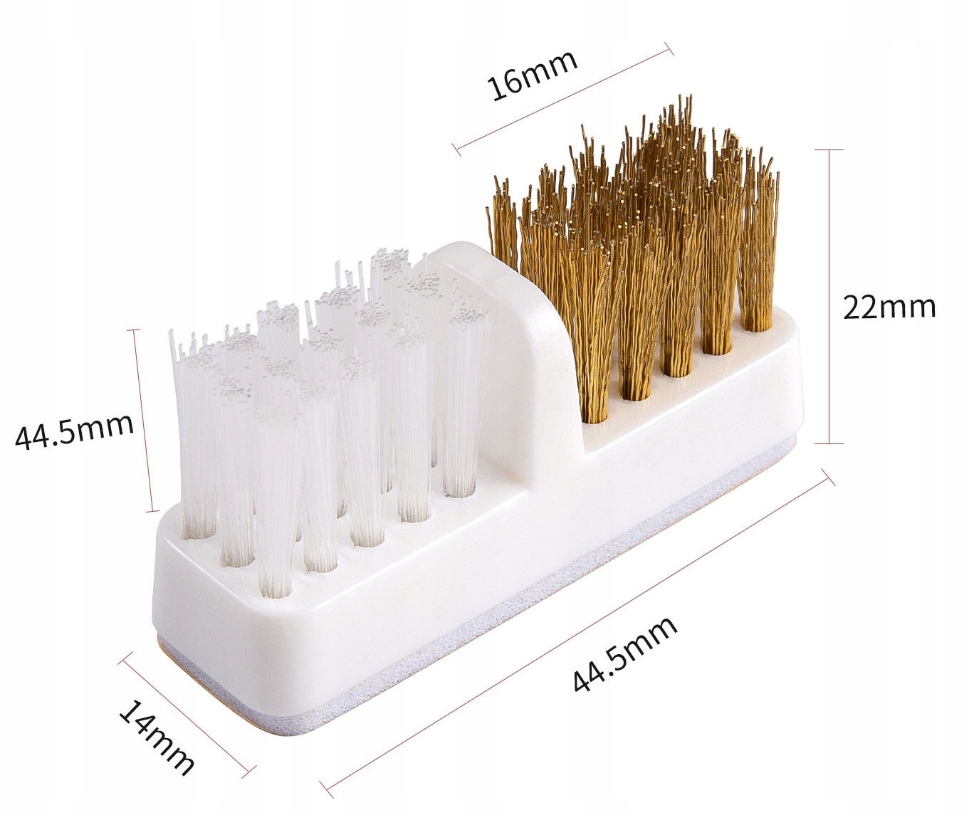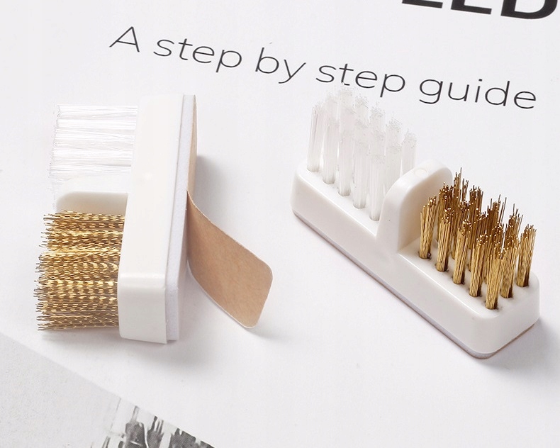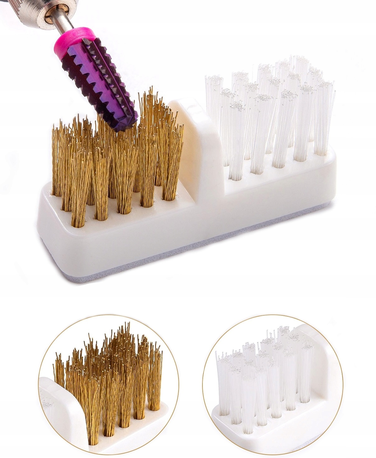 Щітка-самоклейка для чищення фрез і манікюрних інструментів має дві робочі зони: перша з металевою щетиною, друга з жорсткою щетиною. Обидві сторони полегшують очищення кожної поверхні фрез від пилу та залишків матеріалу. Для максимально зручної роботи майстра манікюру цю щітку для чищення різців кріплять на плоскій поверхні.