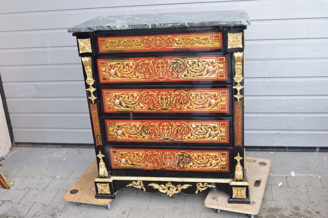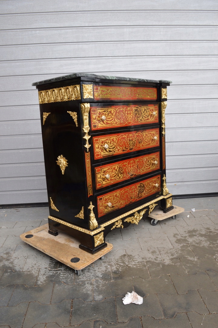 Неймовірно красивий комод BOULLE, багато прикрашений БРОНЗОВОЮ фурнітурою, яка додає чудового шарму меблям . Тверда деревина - дуже важка. Має п'ять містких ящиків.