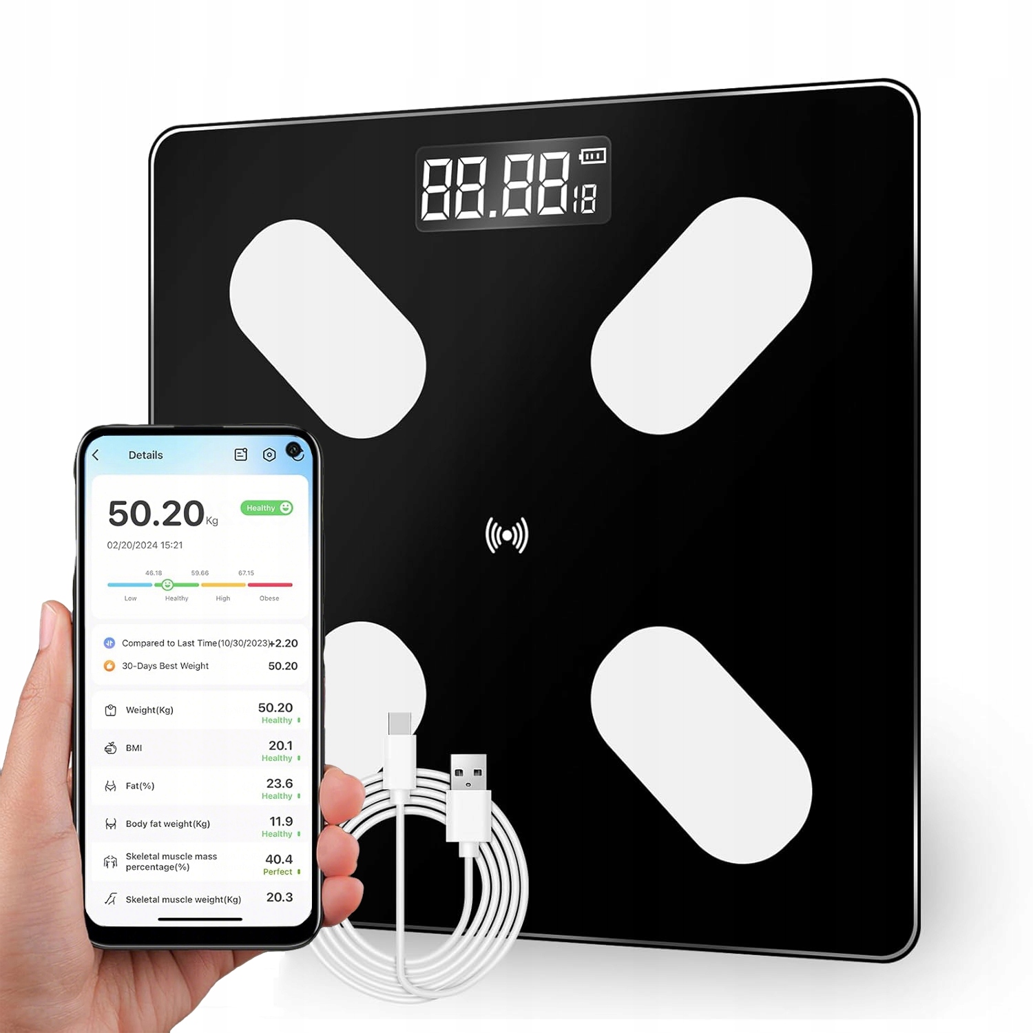 ☑ Комплексний аналіз тіла: Розкрийте складність вашого тіла завдяки тесту нашого тіла, охоплення ваги, індексу ІМТ, відсотків жиру, маси м’язів, води в організмі, зоровій жирі, кістковому маси, метаболізму, білка, рівня ожиріння, віку тіла та нежирної маси. Вам не доведеться витягувати телефон, просто турбота, і дані будуть негайно синхронізовані з нашою програмою.