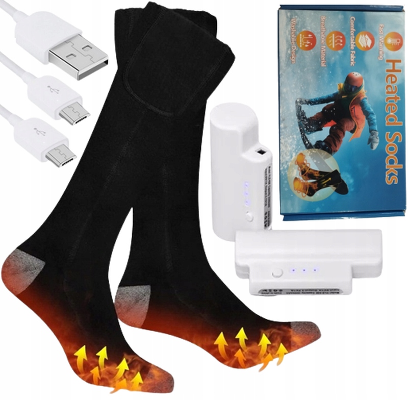 - БАТАРЕЇ В КОМПЛЕКТІ – дві батареї входять до шкарпеток. Після підключення ви ховаєте їх у спеціальні кишені у верхній частині шкарпеток. Заряджання відбувається через USB-кабель. Завдяки розгалужувачу кабель пристосований для зарядки двох акумуляторів одночасно.
