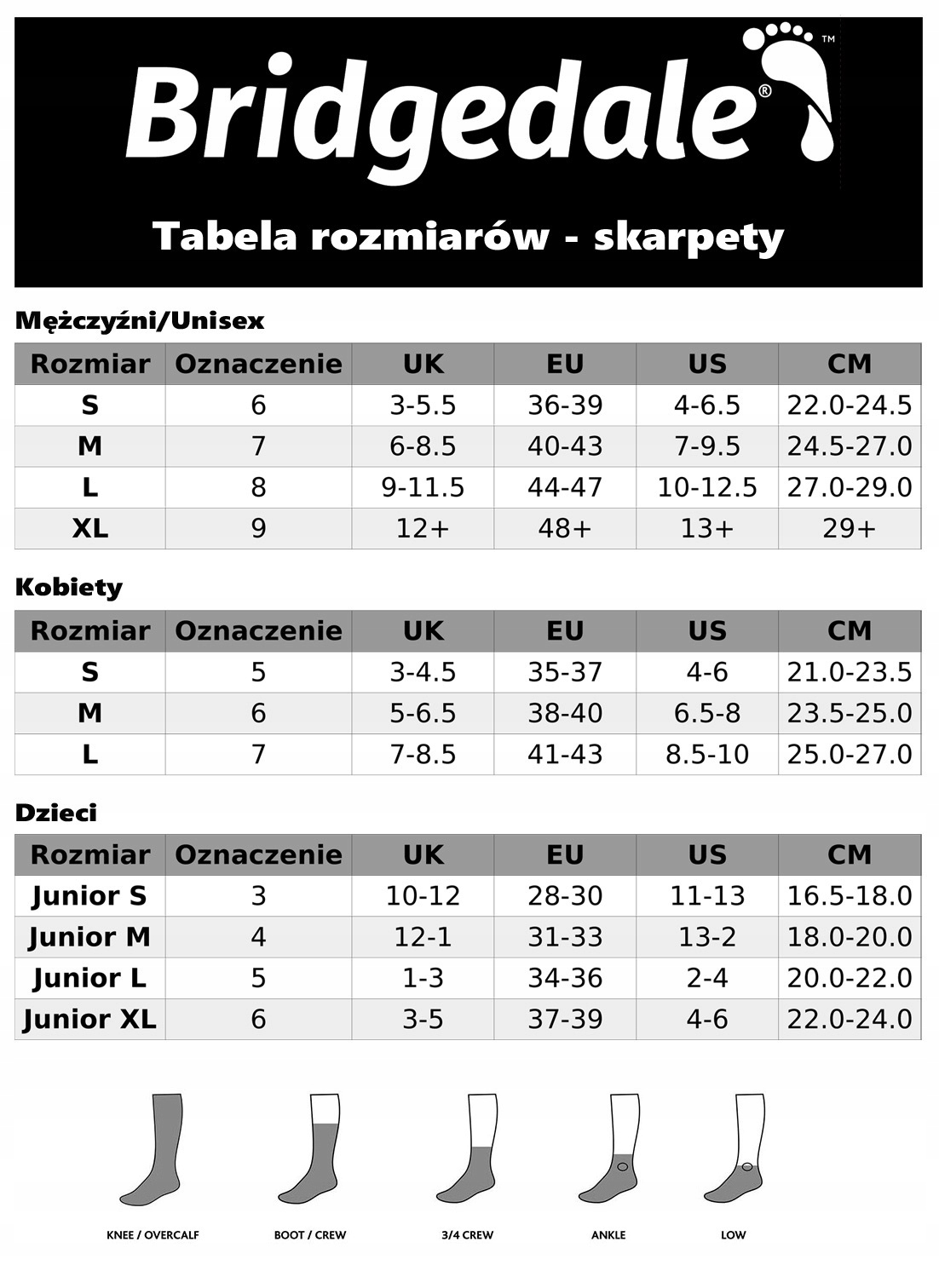 Bridgedale - всесвітньо відомий і шанований бренд. Компанія виробляє найякісніші трекінгові, лижні, бігові та тонкі спортивні шкарпетки з 1980 року. Завдяки використанню новітніх технологій вони гарантують відмінний захист ніг і комфорт використання в будь-яких умовах. Bridgedale спеціалізується на поєднанні натуральних і синтетичних волокон таким чином, щоб виявити всі їхні найкращі властивості в одному продукті.