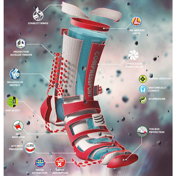 ProRacing Socks V3 - це останнє покоління технічних шкарпеток для бігу. Дуже легкий, з посиленою підтримкою, Compressport® ProRacing Sock V3 зміцнює крок і покращує мікроциркуляцію стопи. Широка частина на пальцях забезпечує додатковий захист, підтримка зводу усуває відчуття печіння ніг, подушки 3D.DOTS і використання компресійних волокон гарантують комфорт, стабільність і тиск.
