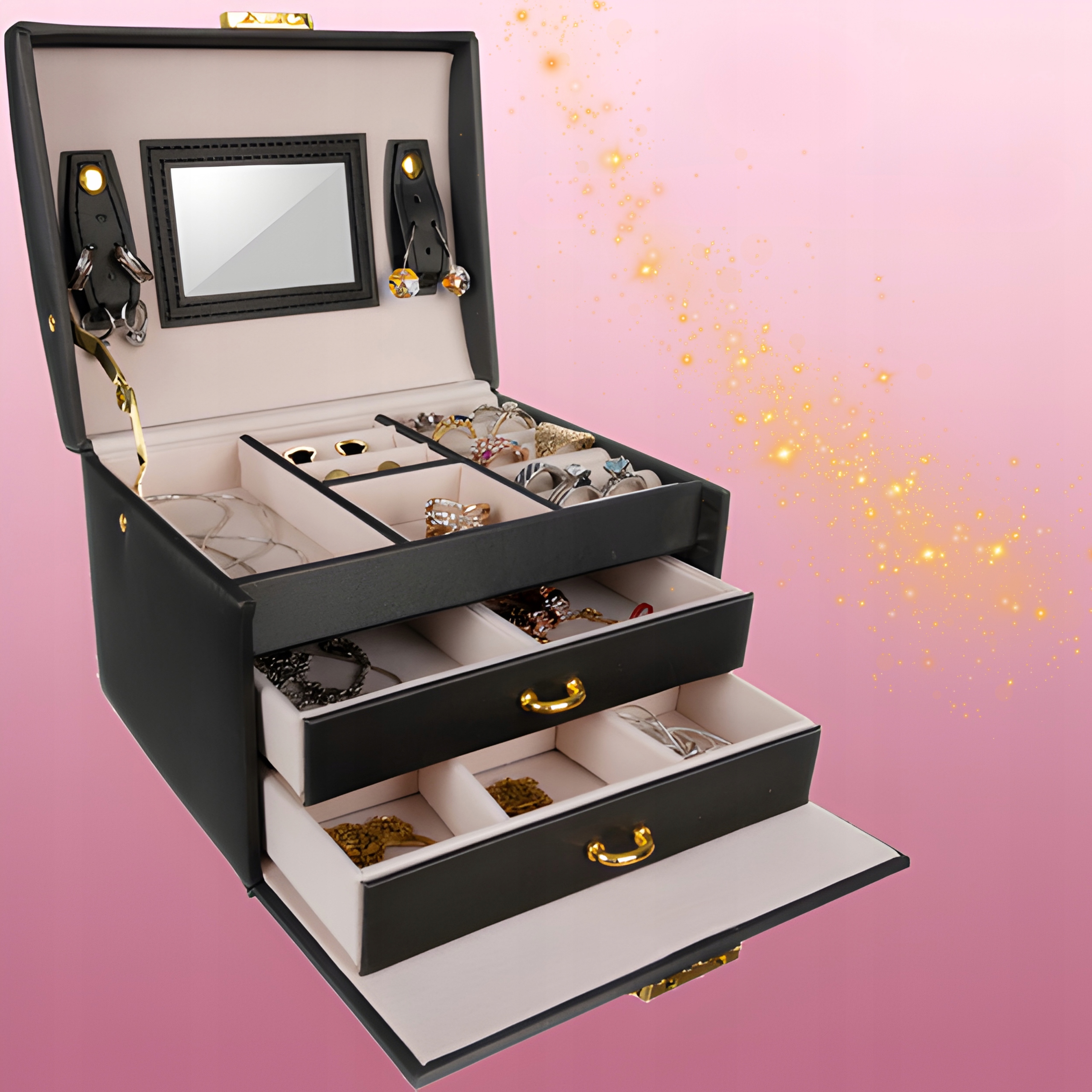 ✔️ Ознайомтеся з атласною скринькою для коштовностей - елегантна скринька з 20 відділеннями, 3 ящиками та дзеркалом, яка захищає та демонструє вашу колекцію.