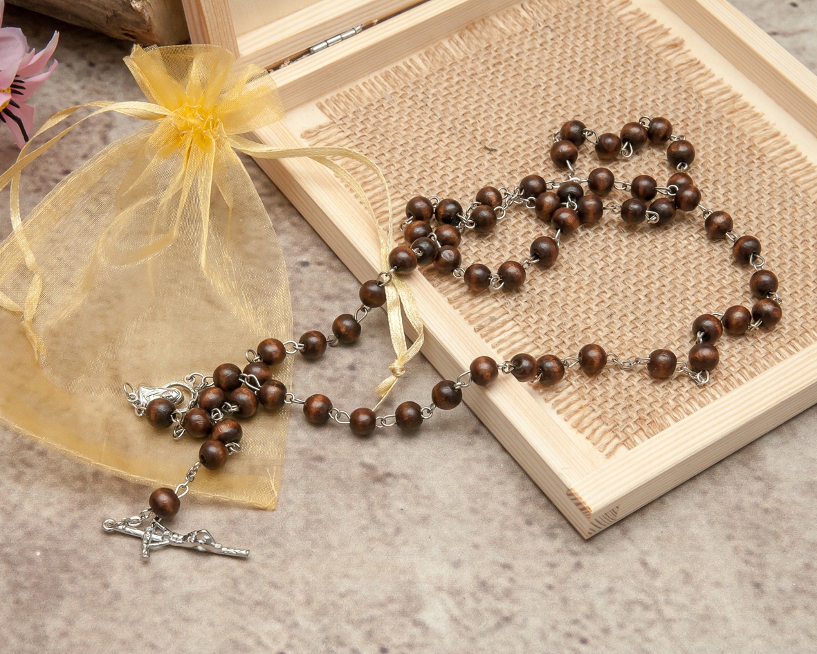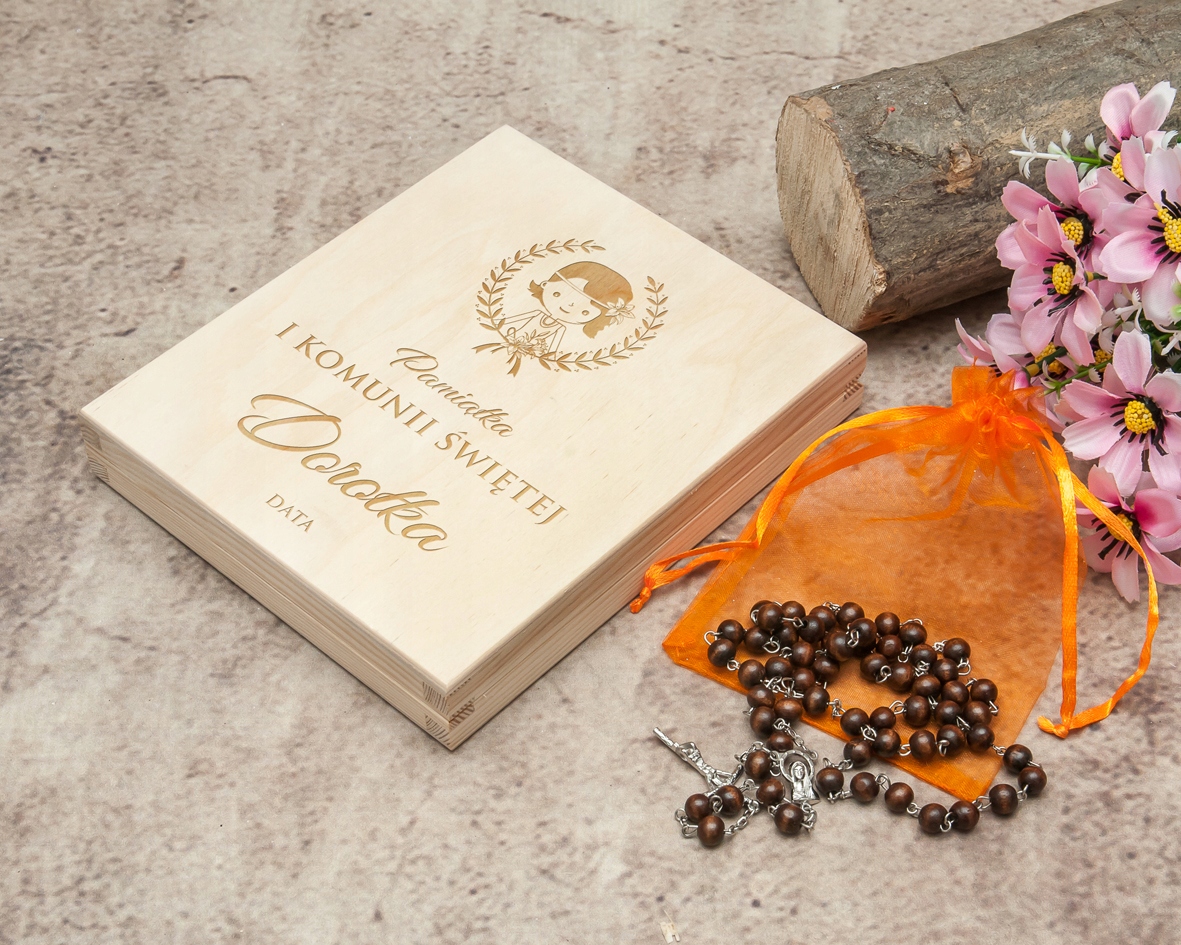 Сувенір Першого Святого Причастя - скринька зі світлого натурального дерева з дерев'яною вервицею в кольоровому мішечку з органзи.