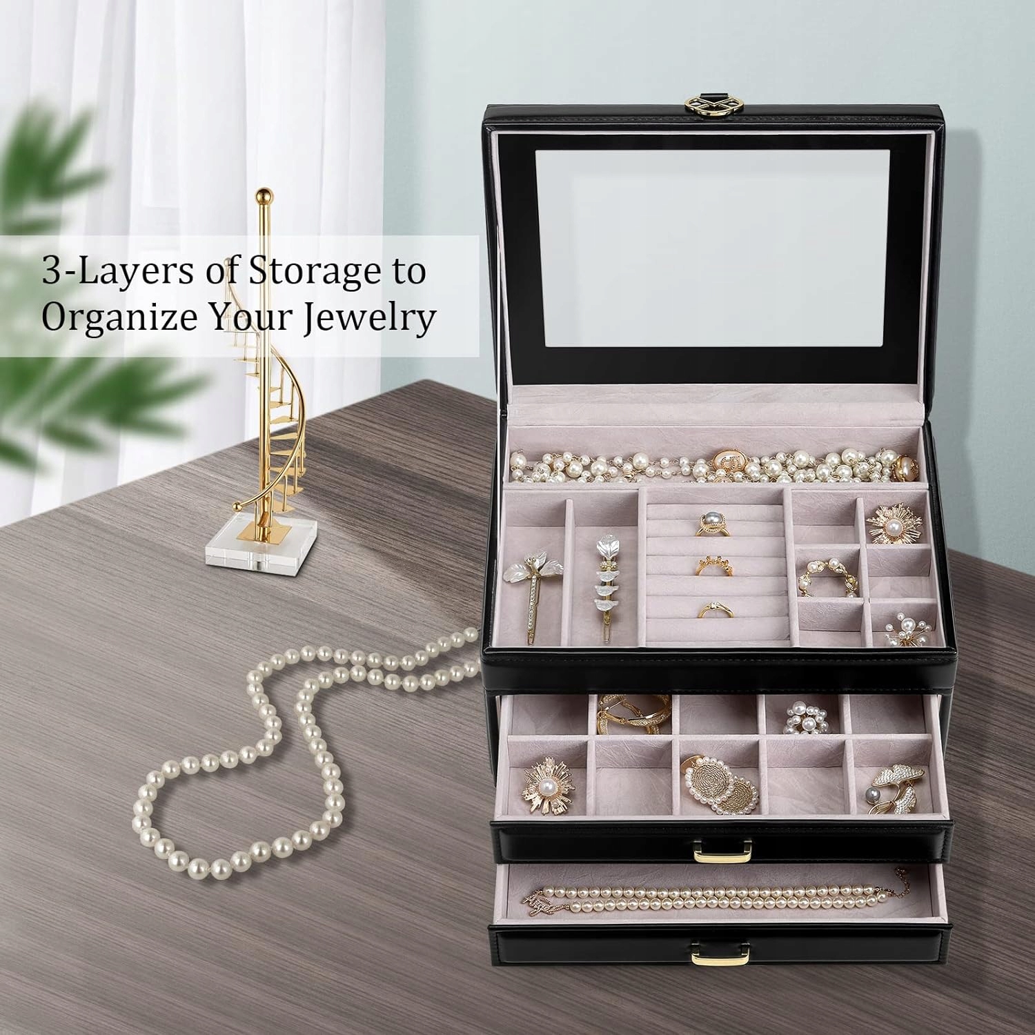 Vlando Jewelry Storage - Jewelry Box зі скляною кришкою - Jewelry Box для жінок з 3 ярусами та висувними ящиками, шкіряний органайзер для прикрас для сережок, намист