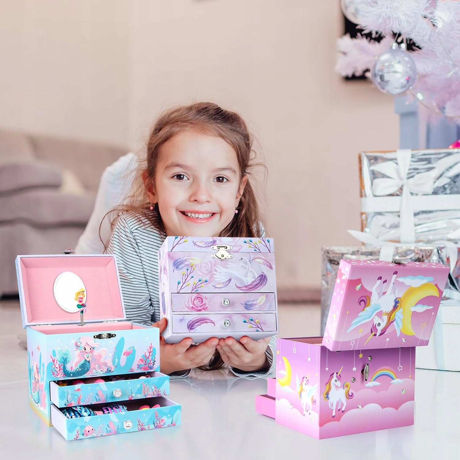 Усередині є дзеркало та фігурка єдинорога, що обертається, яка танцює в ритмі тонкої мелодії, коли відкривається кришка. У практичні відділення можна помістити сережки, каблучки, браслети та інші коштовності, допомагаючи вашій дитині тримати улюблені прикраси в порядку.