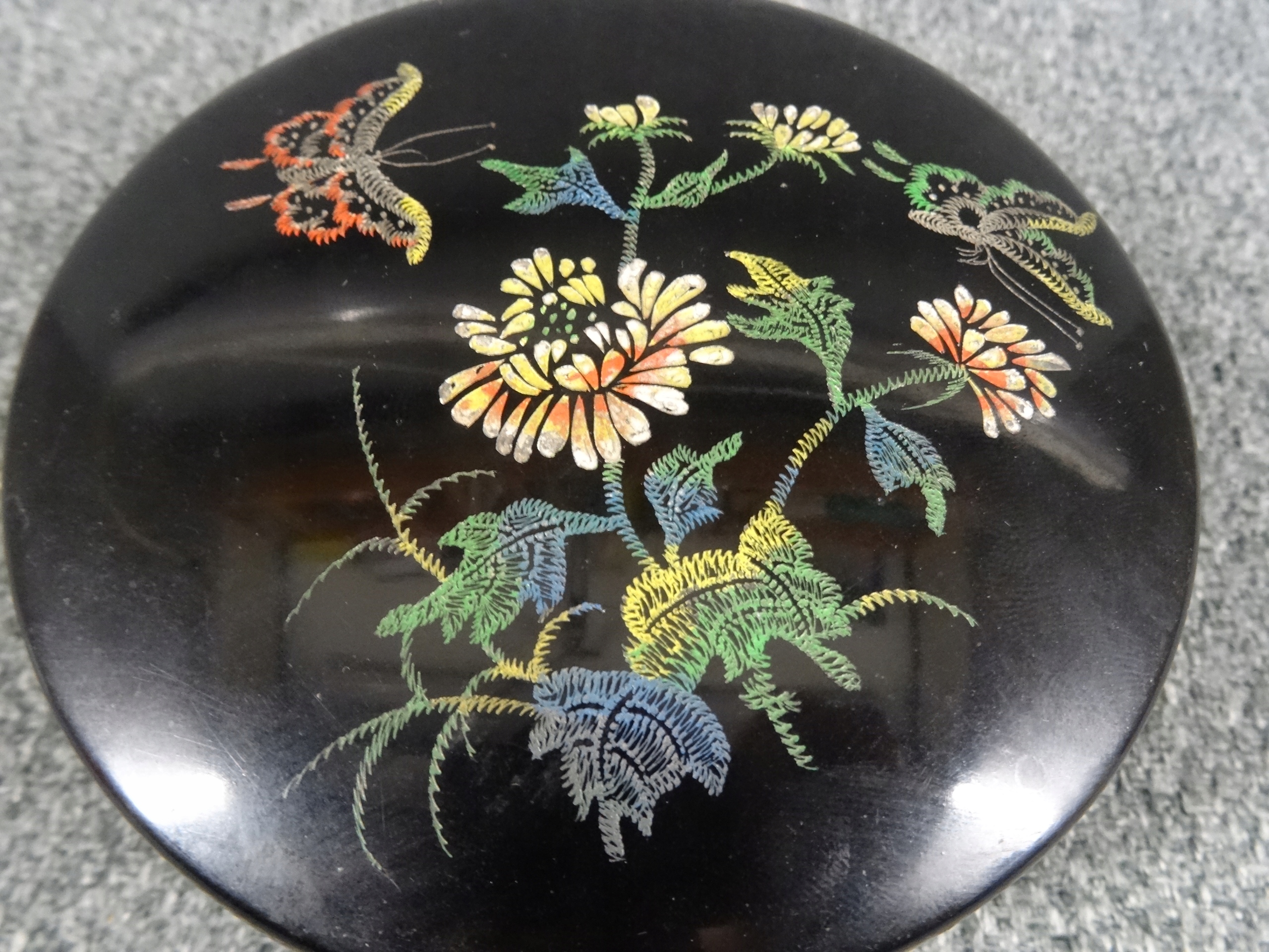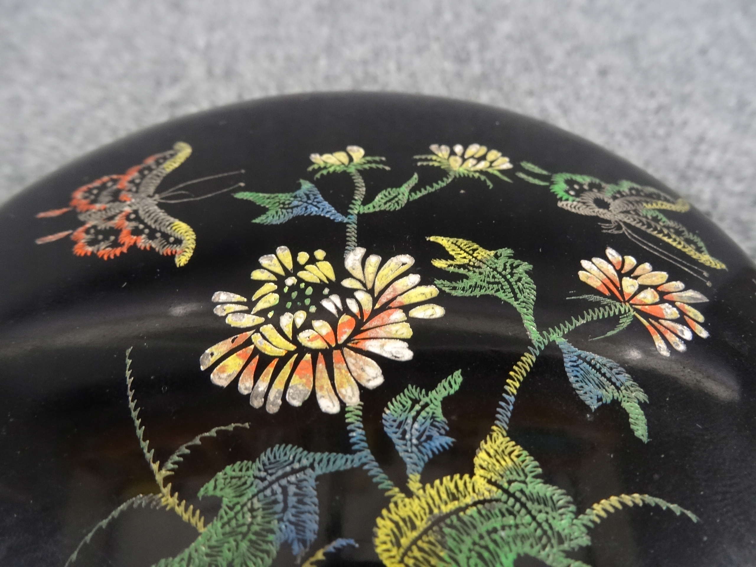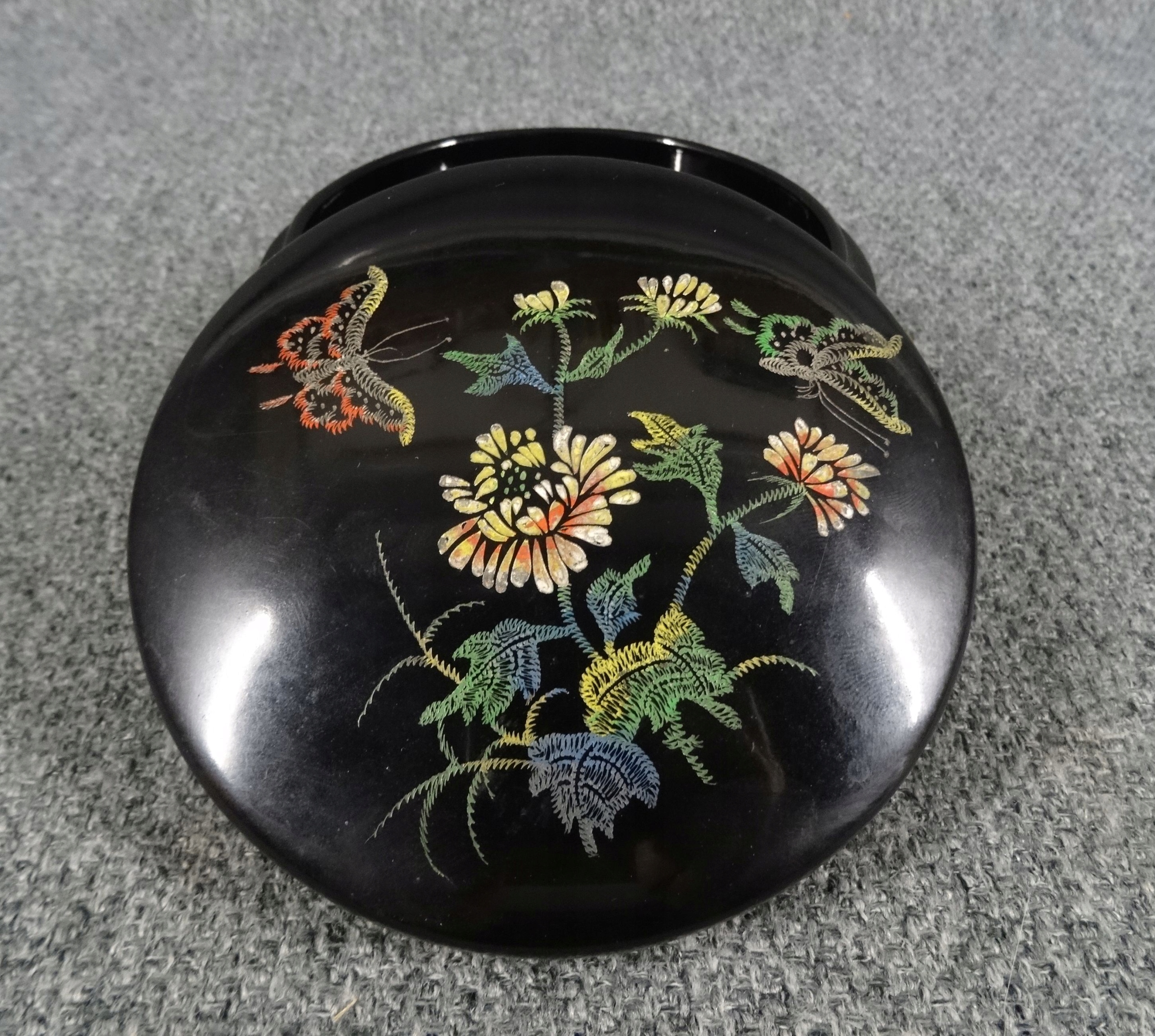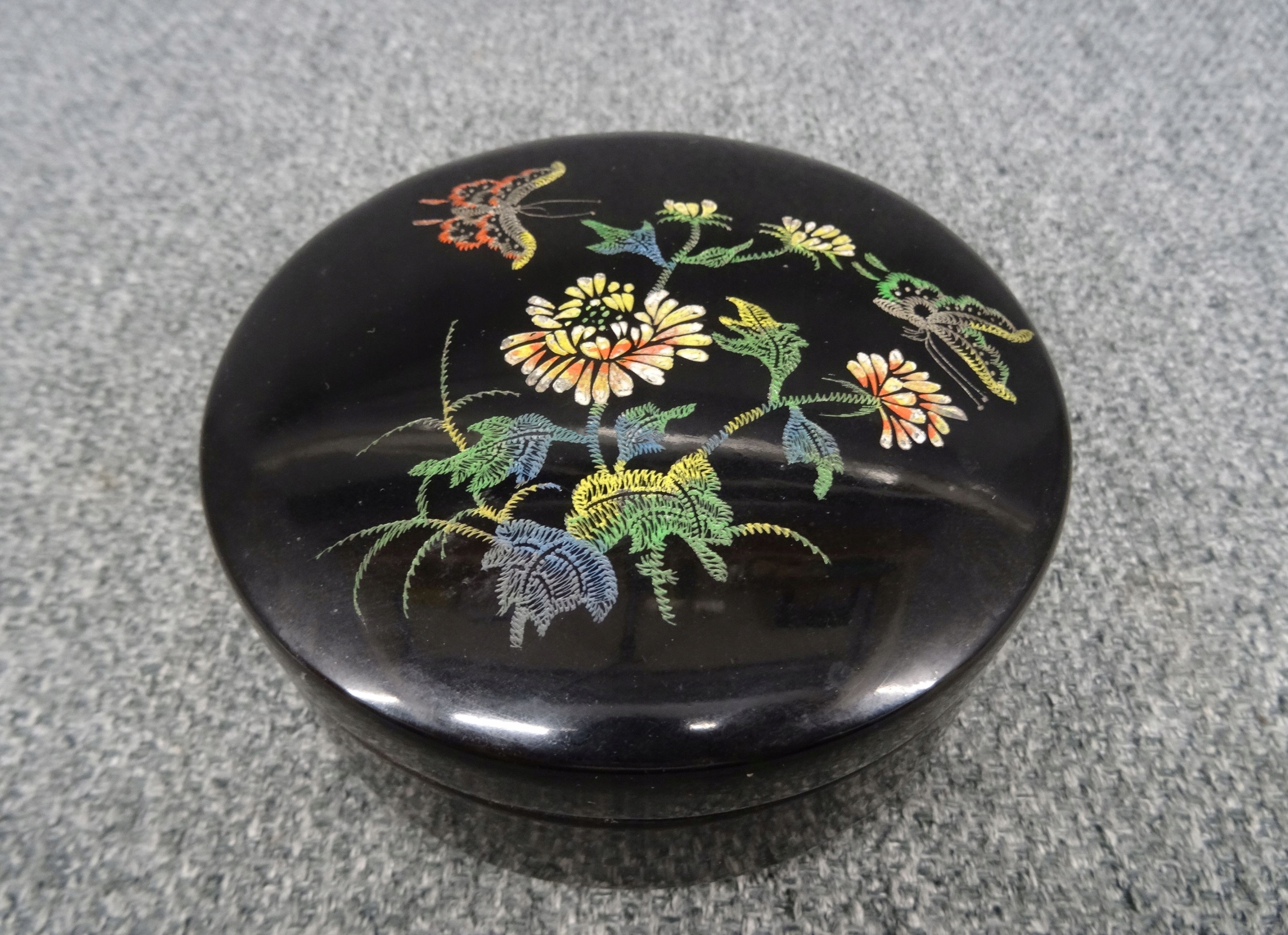 Кухол, шкатулка. Коробка покрита лаком. На кришці вигравірувано квітковий візерунок і два метелики. Гравюри намальовані яскравими кольорами.